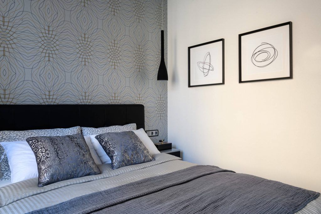 Centrul de interes al dormitorului matrimonial este patul foarte generos si tapitat. Simplitatea si functionalitatea sunt aduse in prim plan prin realizarea unui ambient modern care ne lasa imaginea unui spatiu elegant si rafinat Jocul de texturi, atentia la detalii si tapetul cu tema gometrica evita monotonia si creeaza un impact vizual placut. Pe un fundal predominat alb s-au integrat in schema cromatica nuante de gri, care echilibreaza spatiul, contribuind astfel la o atmosfera odihnitoare si relaxanta.