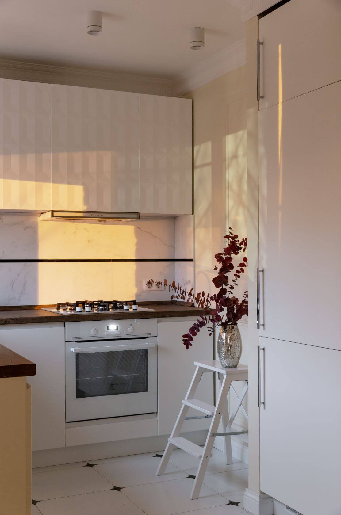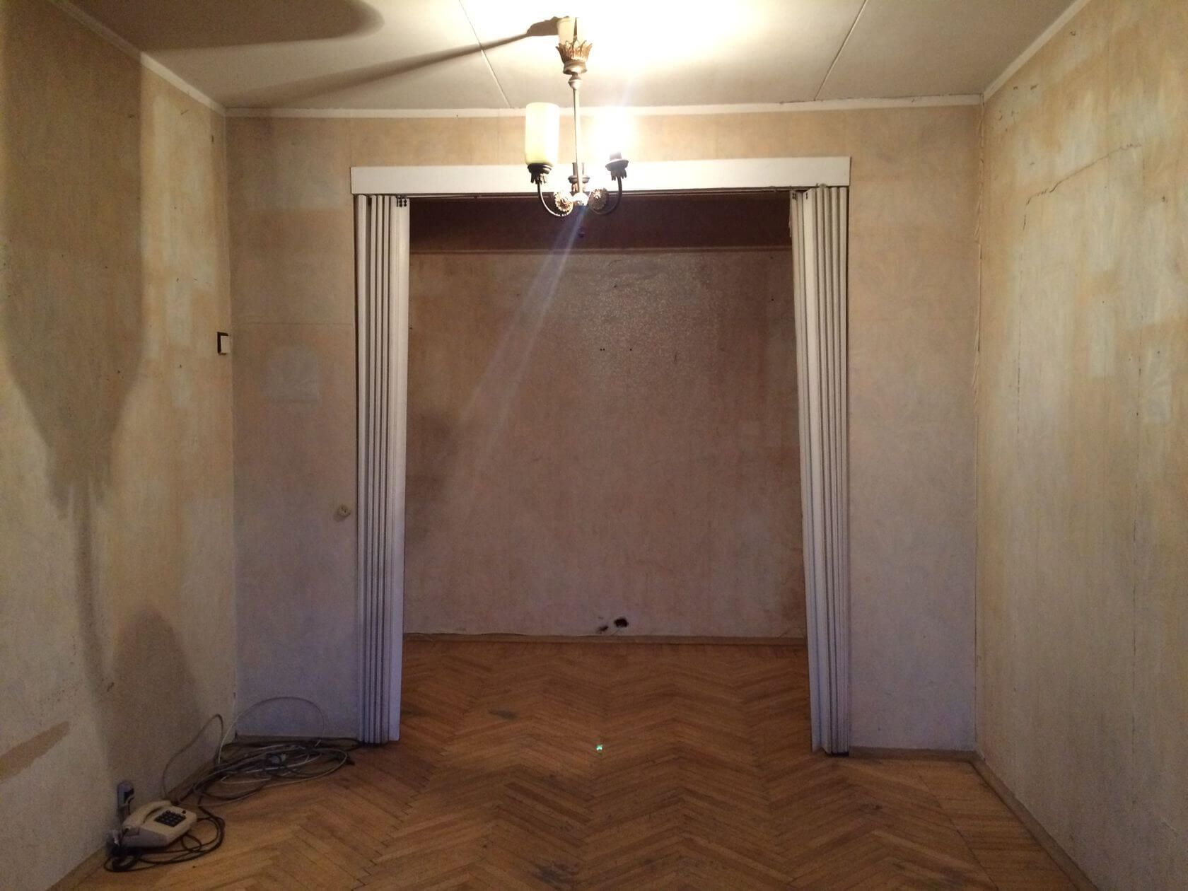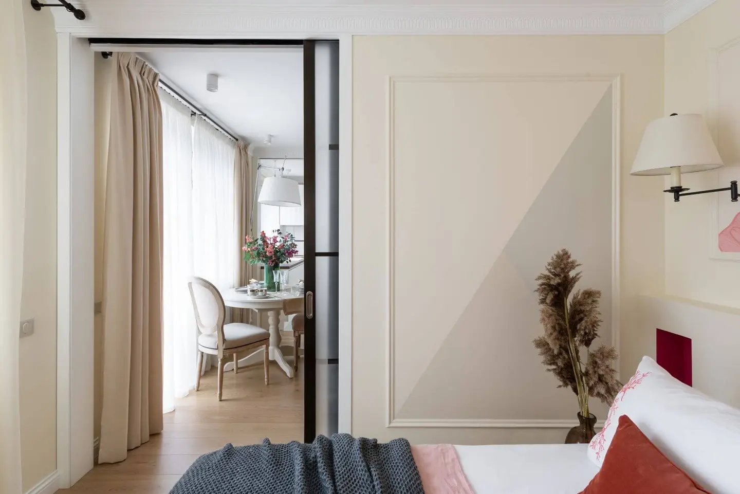 Acelasi sistem de usi separa camera de zi si de bucatarie; 3 camere delimitate ingenios de acelasi sistem care nu ia din spatiu asa cum ar face-o usile clasice.