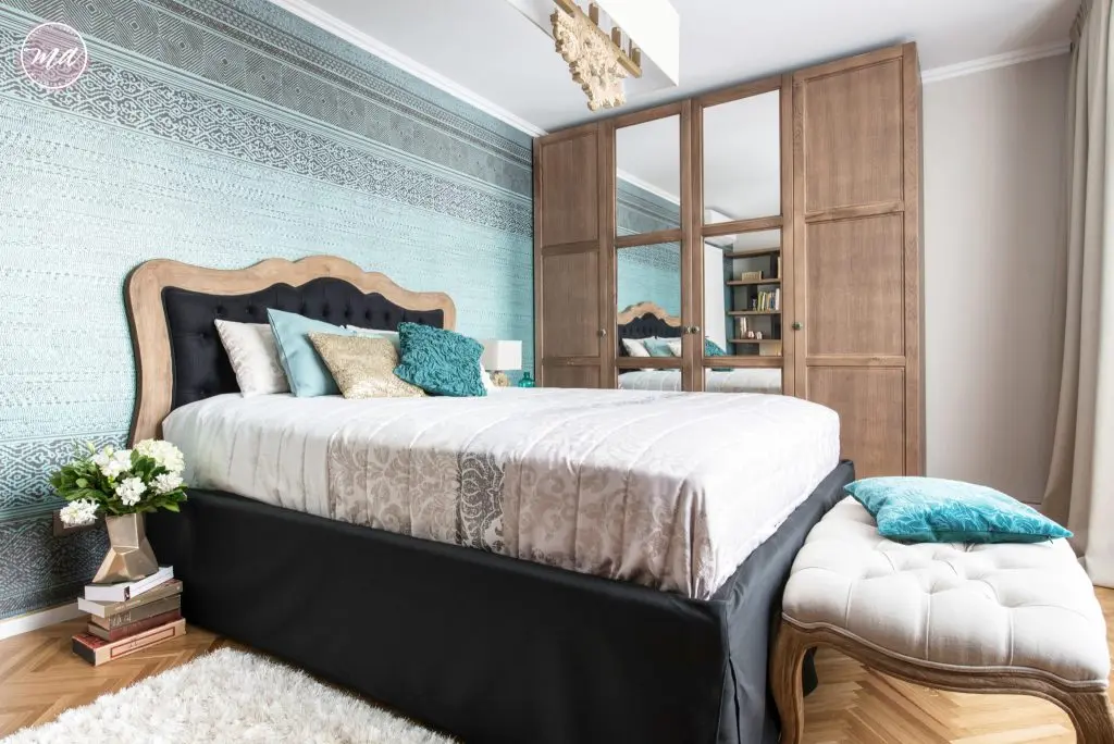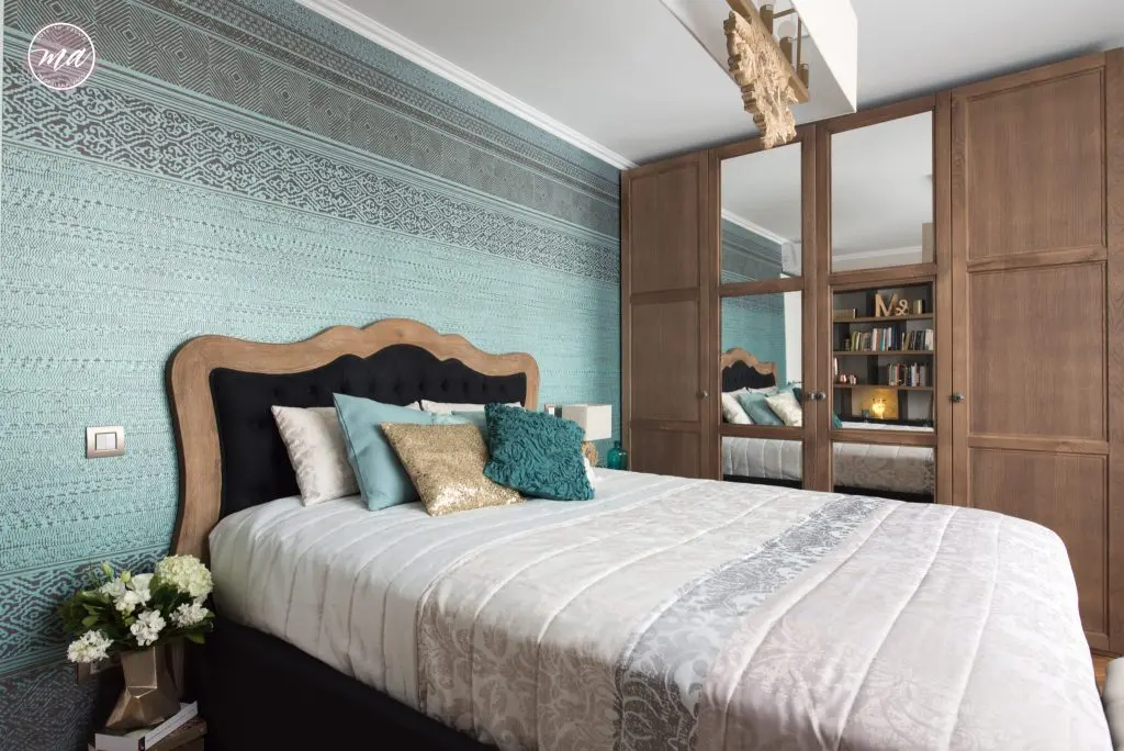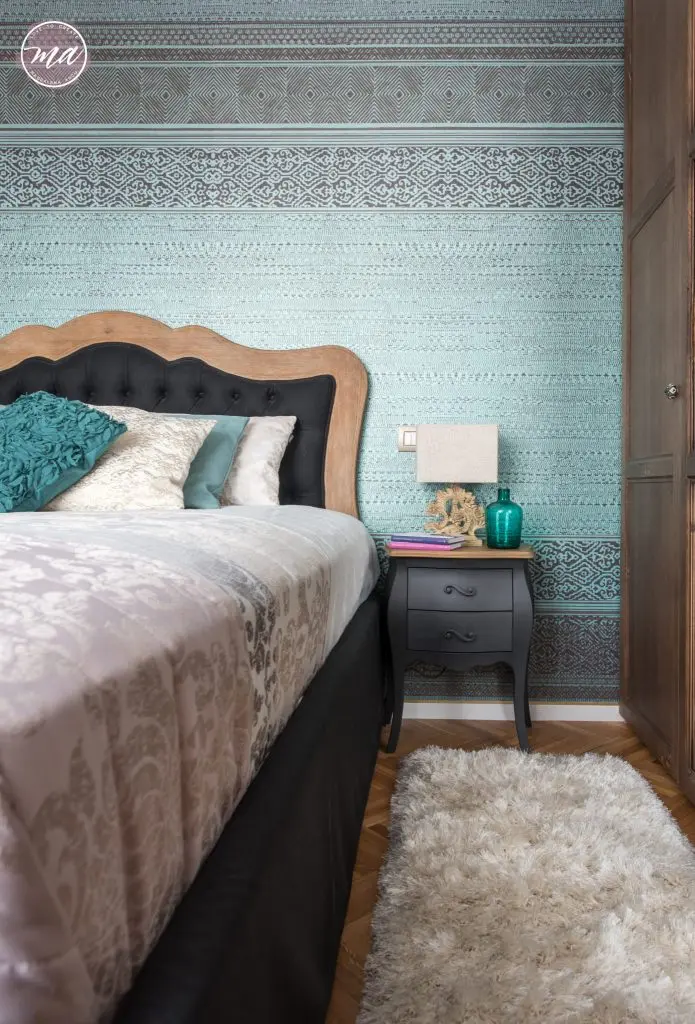 Tapetul a fost utilizat ca un fond neutru pe care se evidentiaza mai bine decoratiunile, insa atat cel din living cat si cel din dormitor au propria poveste si contribuie la farmecul general al amenajarii. Fototapetul din dormitor (model Siroc, marca Eijffinge) aminteste de un vant cald din desert; cel din living se numeste Makrana (dupa modelul de marmura folosit la Taj Mahal) si este achizitionat de la Osborne Little.