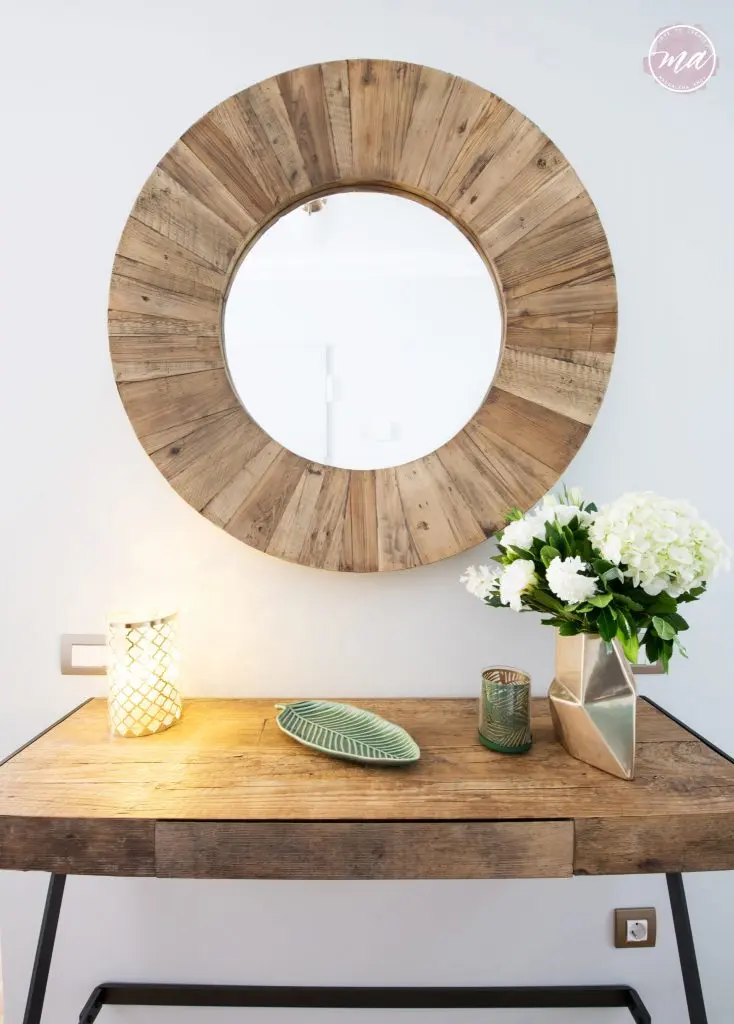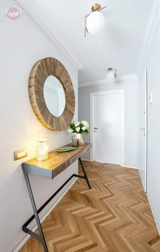 Multe din piesele de mobilier din lemn masiv au fost comandate de pe siteul producatorului italian Dialma Brown (etajera pe structura metalica cu blaturi din lemn reciclat, oglinda cu diametrul de un metru din hol, tablia impozanta a patului).