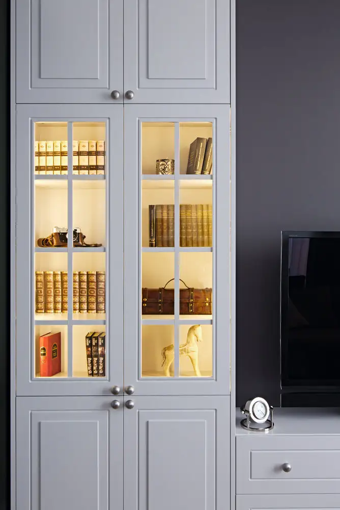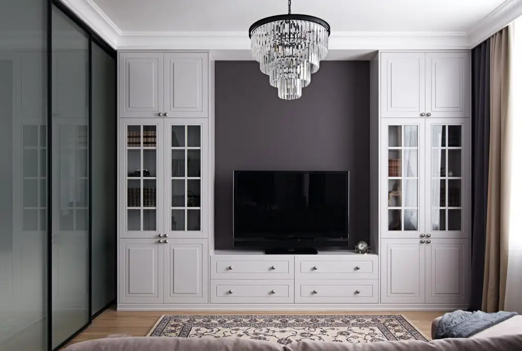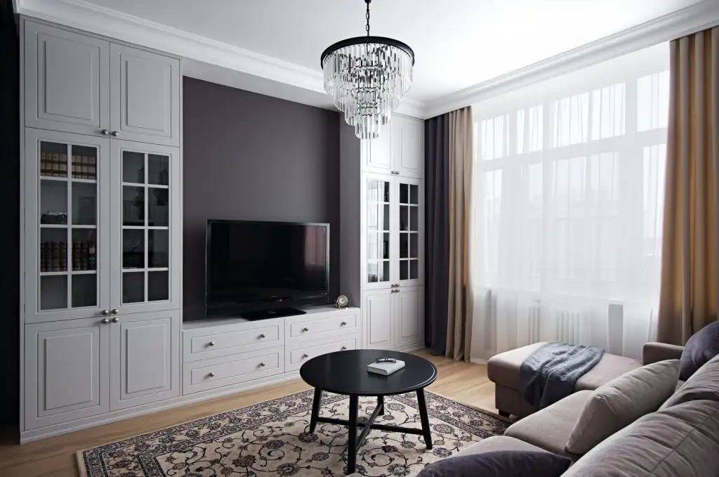 Livingul a fost mobilat intr-o maniera clasica, simetrica; este compus din doua piese inalte de biblioteca, ce incadreaza o comoda cu patru sertare ornamentate pe care este amplasat televizorul. Logia, cu acces din bucatarie, dispune si ea de un dulap incastrat, fara a limita prea mult din zona de relaxare amenajata aici.