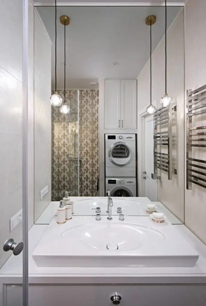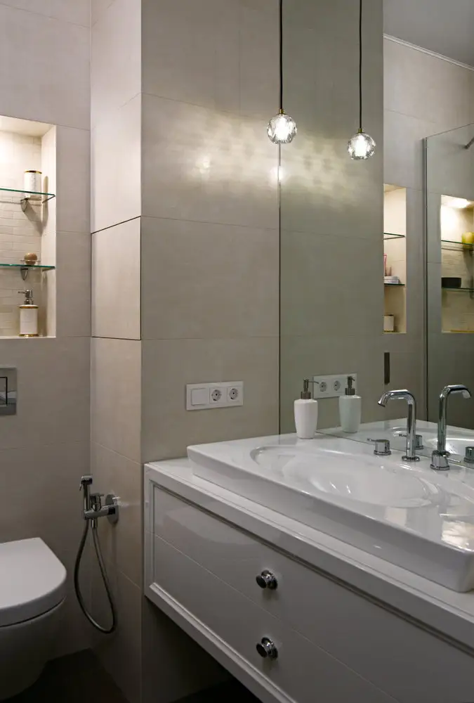 Rama metalica neagra a acestor usi contribuie la stilul general elegant si sobru al amenajarii. Baia generoasa, de aproape 5 metri patrati, are acces din holul de intrare si este lipita de peretele scurt al bucatariei.