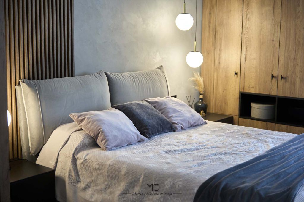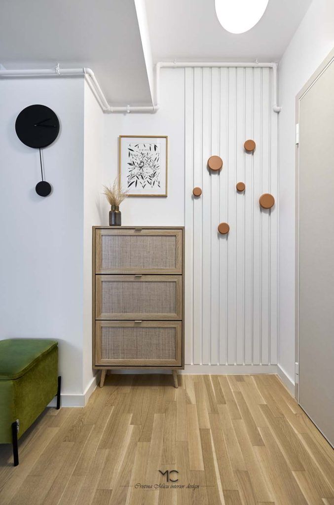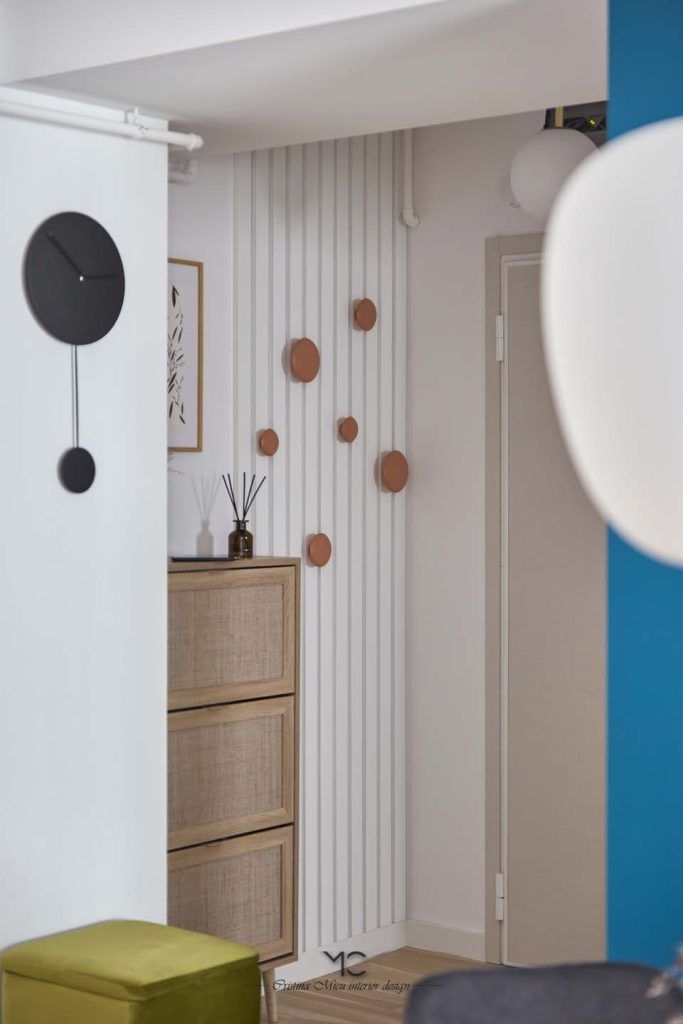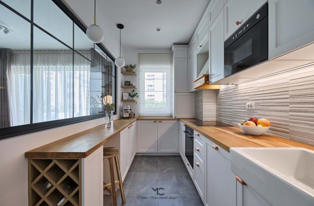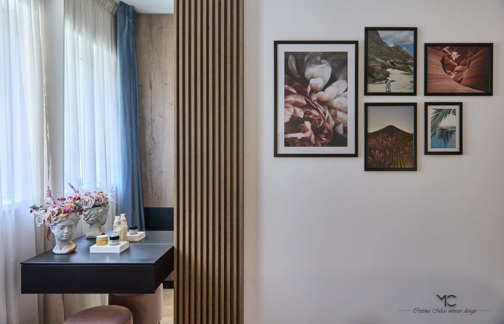 Arhitectul proiectului, Cristina Micu ne povesteste ca “la momentul inceperii proiectului de design interior, apartamentul avea montate finisajele interioare de la dezvoltator, insa asa cum procedam de fiecare data, pentru a da o nota personala locuintei, am intervenit pe anumiti pereti cu finisaje speciale, cum ar fi vopsea decorativa si vopsea lavabila colorata, creand accente pentru fiecare camera. La bucatarie am adaugat ceramica noua pe perete, in zona dintre corpurile de mobilier.”