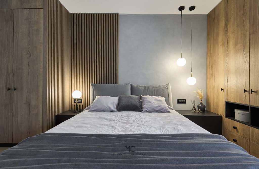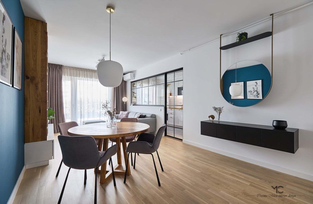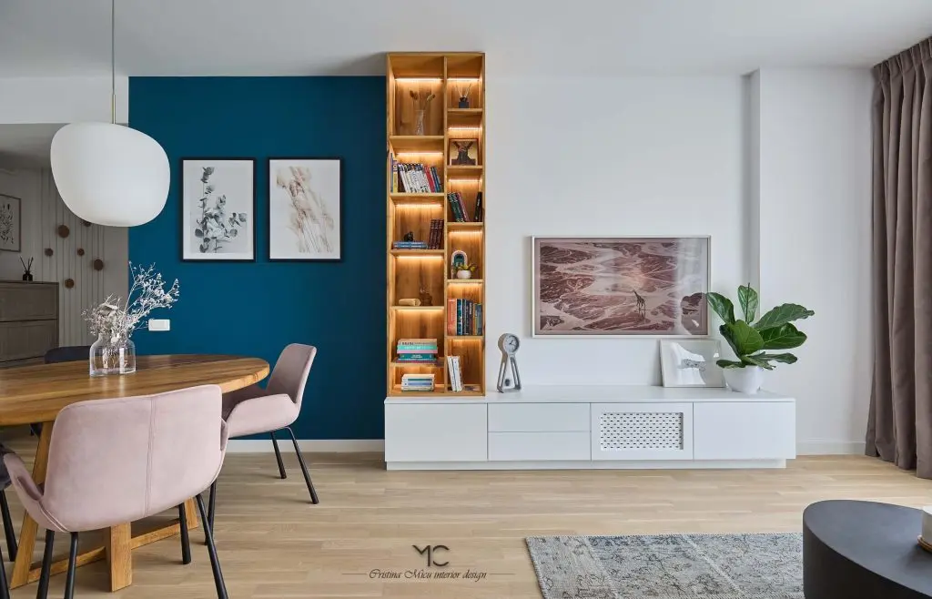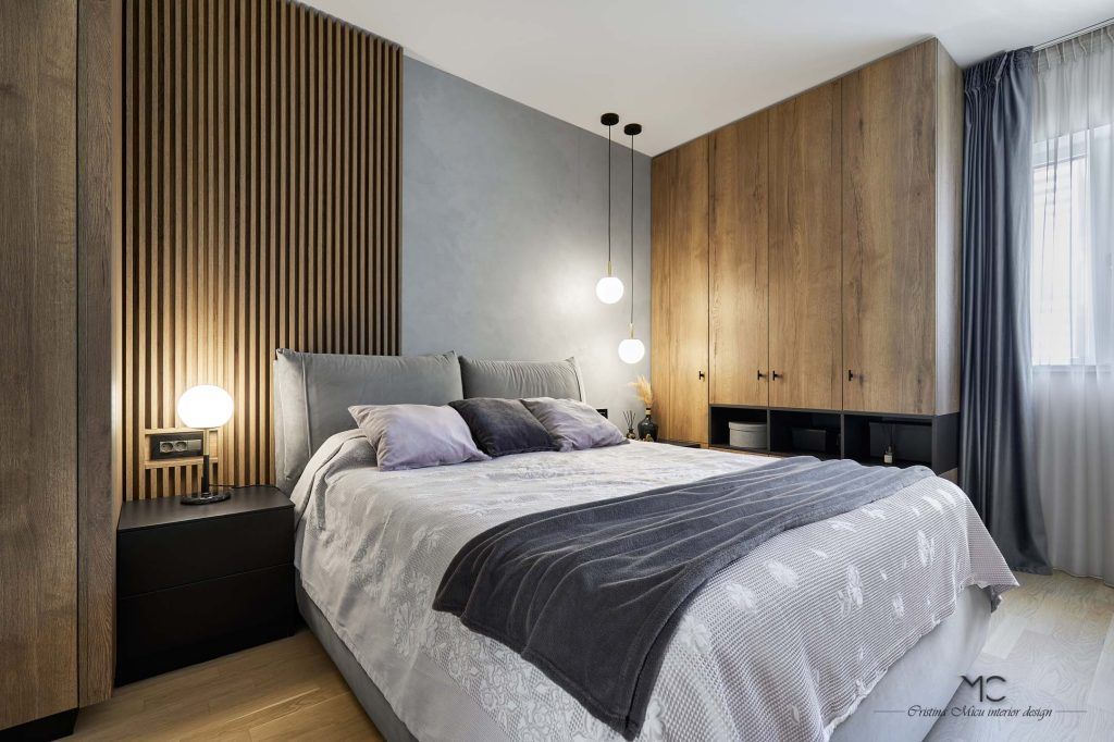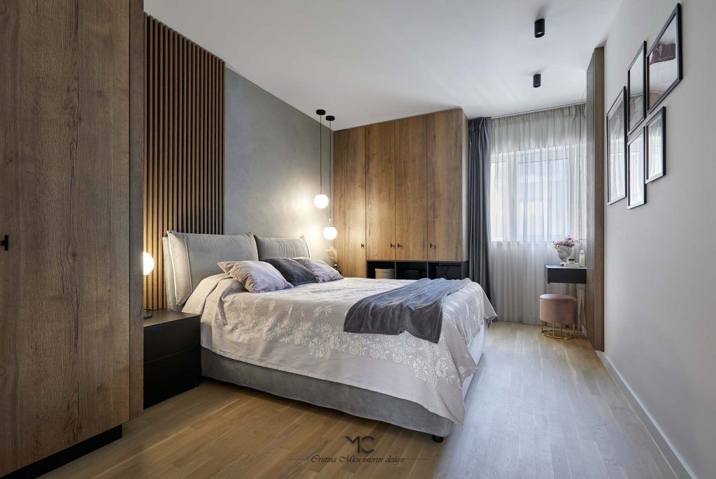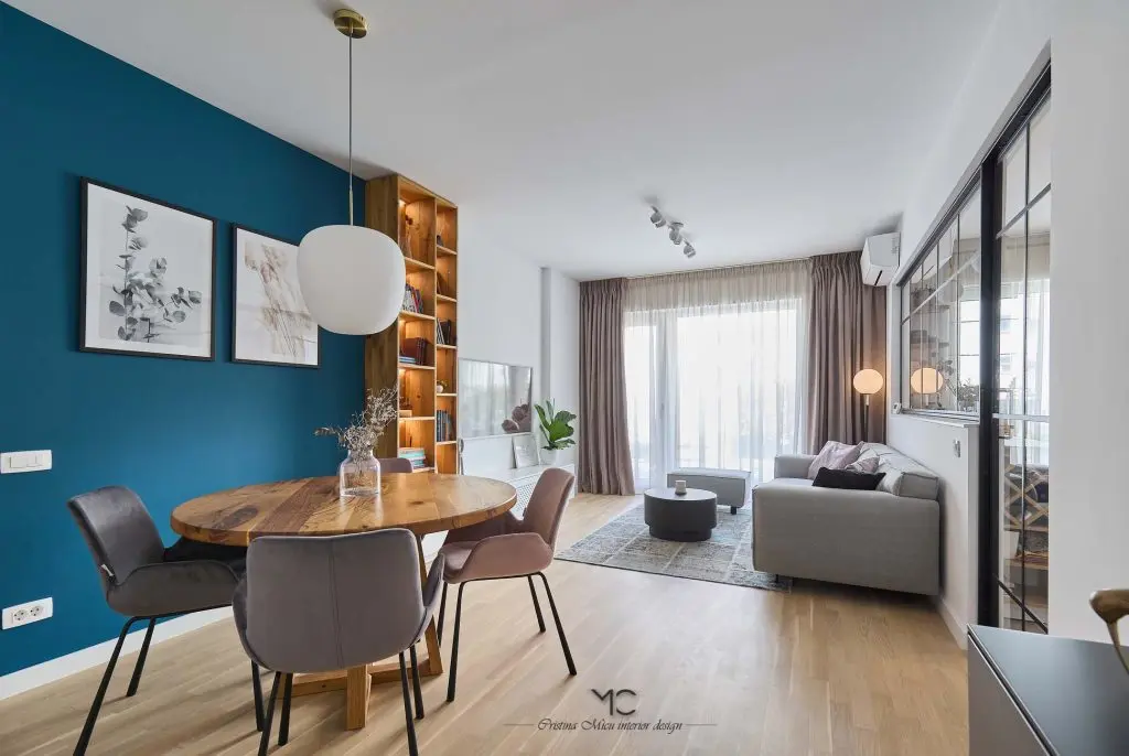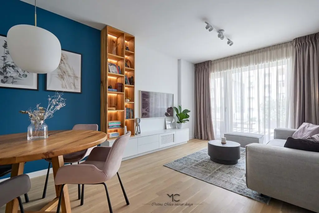 Nuante neutre, predomina griurile si albul, cateva culori pudrate si accente de albastru intens formeaza paleta cromatica a locuintei, la care se adauga cu succes lemnul, prezent atat la mobilier cat si ca riflaje pe pereti sau elemente de decor.