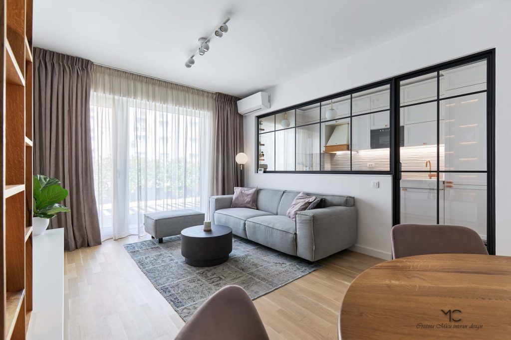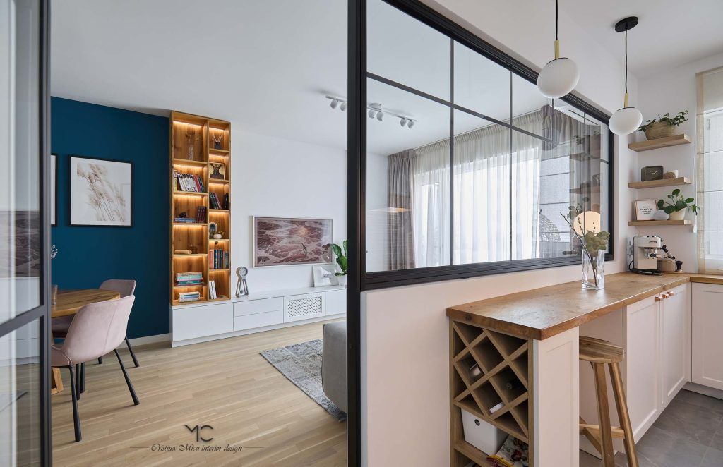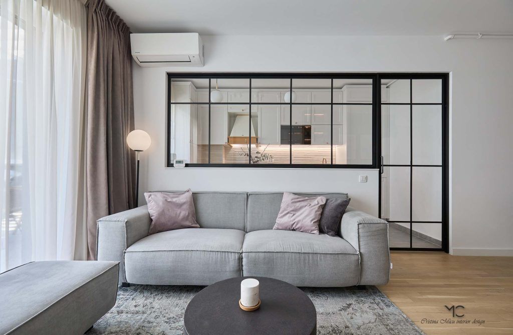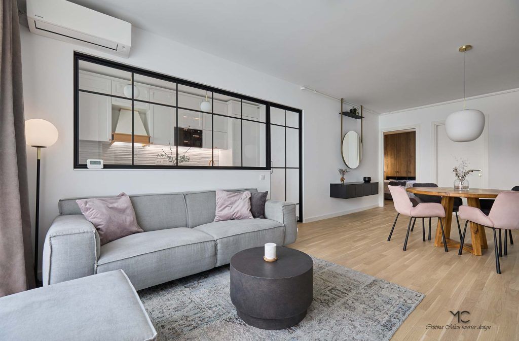 Unul din elementele cheie al amenajarii este relatia living-bucatarie: proprietarii si-au dorit sa fie cat mai transparent, sa para ca spatiul este mai mare si sa existe o comunicare vizuala dar in acelasi timp sa poata inchide etans usa de la bucatarie cand este nevoie. Astfel a aparut un perete de sticla cu rama neagra, cu un aer usor industrial.