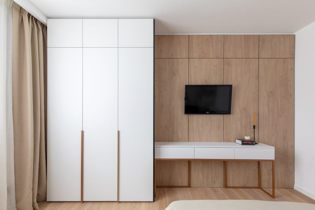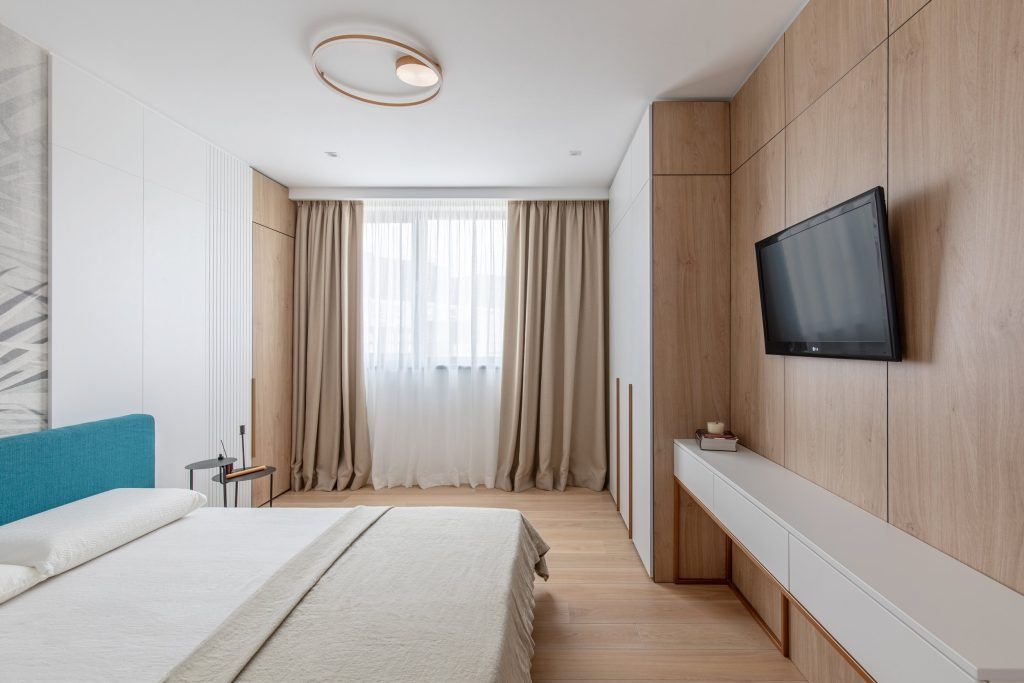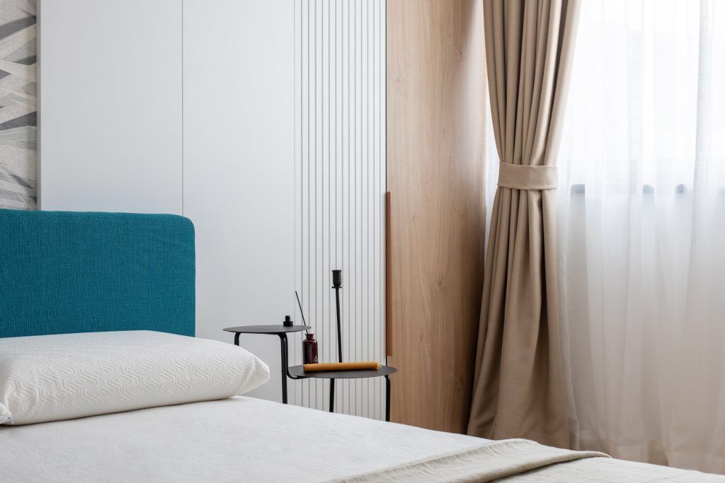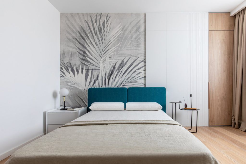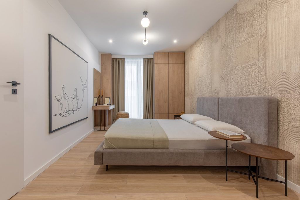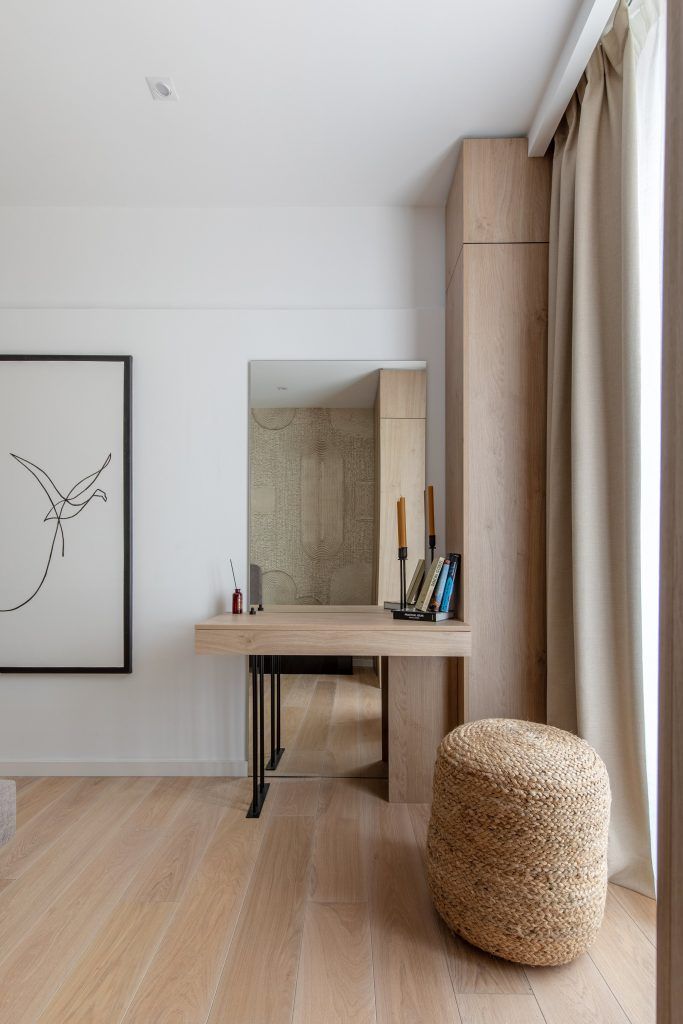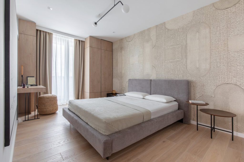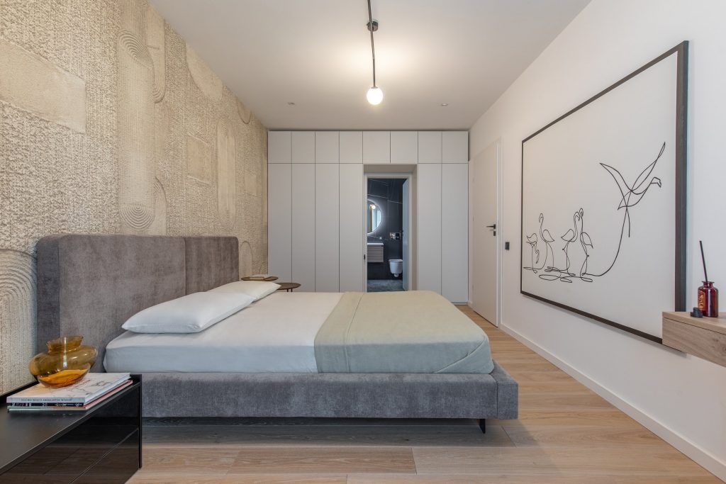 In cele doua dormitoare destul de spatioase se continua conceptul general al locuintei; regasim o paleta cromatica neutra , placaje de lemn natural, tapet in relief. Pentru draperii, tapiteria patului, taburetul masutei de makeup, s-au folosit texturi rugoase, care trimit cu gandul la panza de sac si o apropiere senzoriala de elementele naturale.