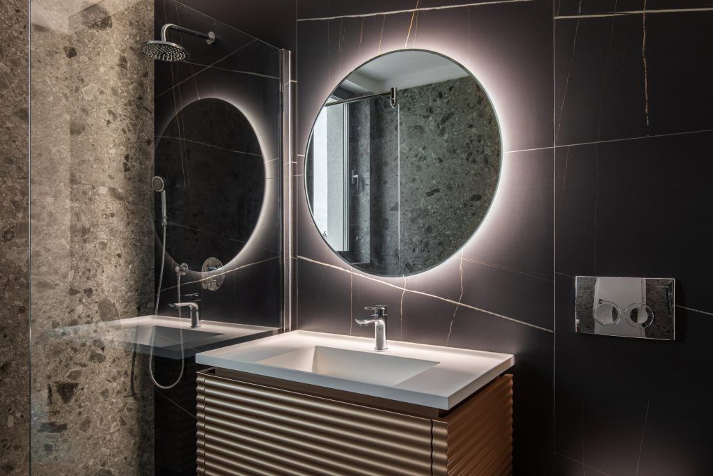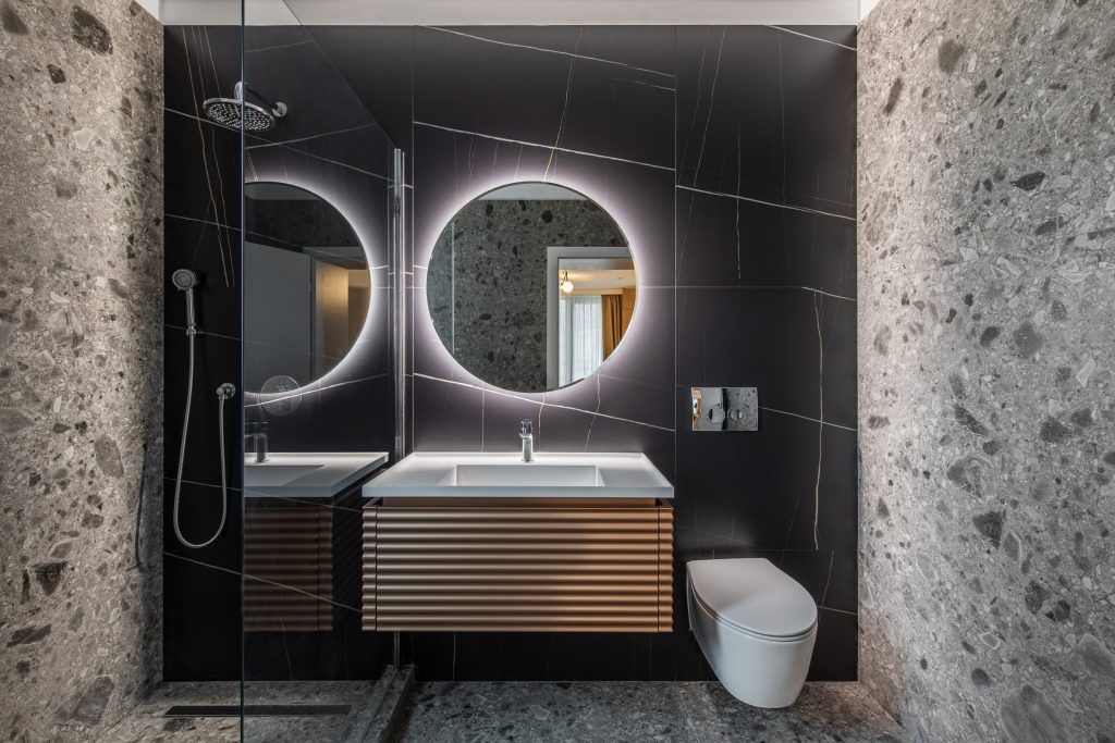Amenajarea baii reflecta amprenta echipei Pure-Mess : “elementele naturale sunt reprezentate prin placile de ceramica Iseo de la Inalco si reprezinta latura bruta a baii. Ele pun in evidenta marmura neagra Azalai care ofera profunzime si evidentiaza detaliul mobilierului modern, din M DF frezat, vopsit in culoarea cuprului si cu finisaj satinat. “