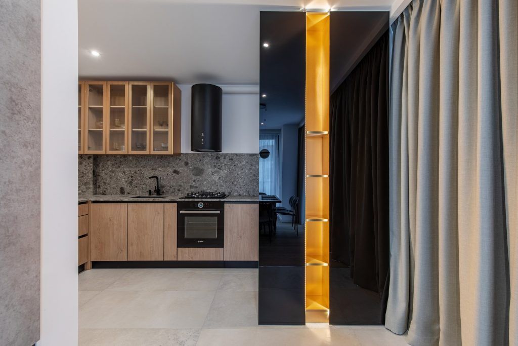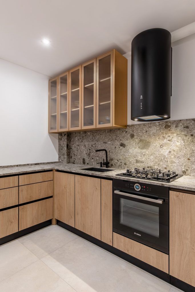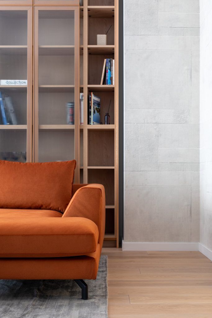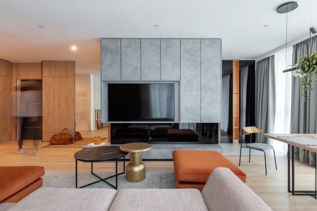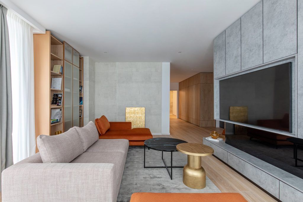 Mult lemn, beton aparent, finisaje neregulate , aparent imperfecte, multe texturi rugoase in nuante calde, pamantii, dar si finisaje lucioase, perfect lustruite, marmura, sticla. Toate au fost puse in echilibru cu multa grija pentru a reda atmosfera de “acasa” acestui apartament de trei camere.