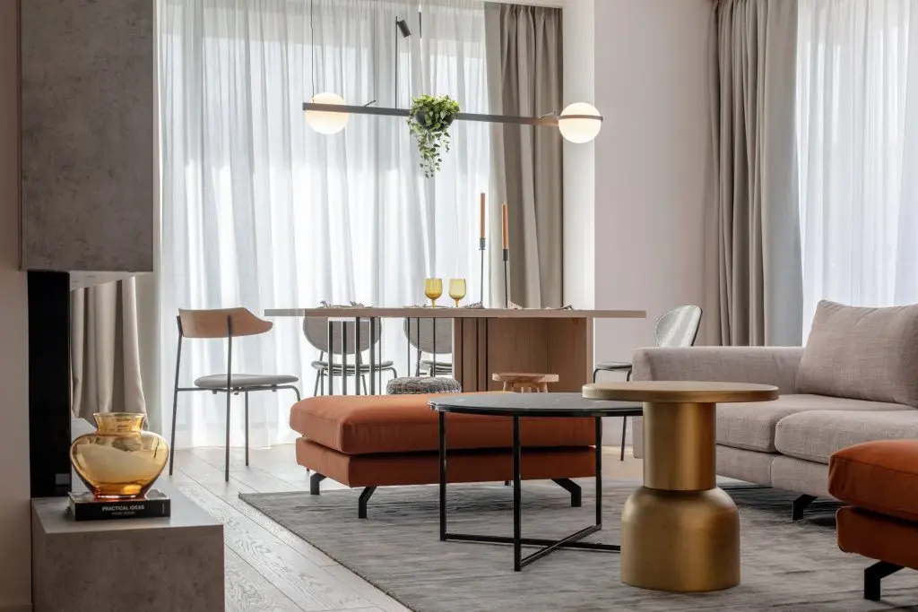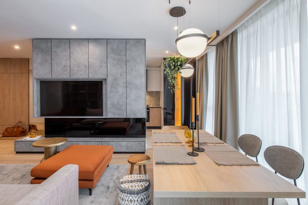Zona de zi a locuintei este un open space primitor, in care toate zonele comunica eficient si confera senzatia de spatiu amplu. Canapeaua supradimensionata, dintr-un material textil gri, este elementul central al zonei de zi; contribuie la relaxare si deconectarea de lumea de afara.