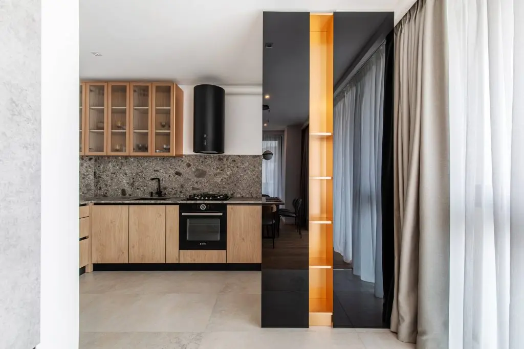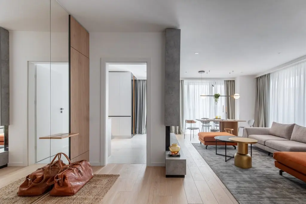 Pe langa latura sa functionala (avand si foarte mult spatiu de depozitare), holul a fost tratat ca o tranzitie intre cele doua influente stilistice majore abordate in cadrul proiectului. Dispune de o oglinda generoasa in care putem vedea reflexia zonei de zi .
