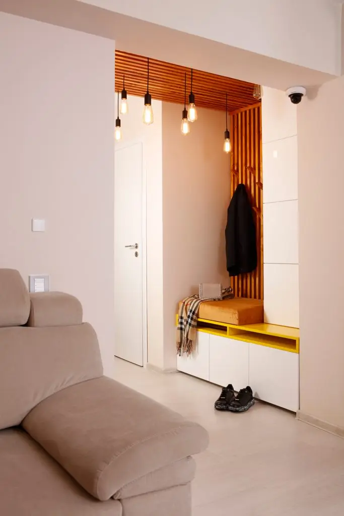 Luand in considerare spatiul redus al apartamentului, arhitectul a optat pentru renuntarea la peretele care despartea initial holul de livingroom pentru a mari vizual spatiul si a crea o amenajare functionala, in care zonele sa comunice eficient si armonios.