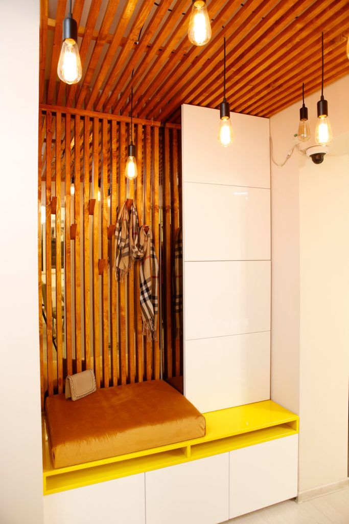 Amenajat pentru o familie tanara, cosmopolita, holul face trimitere catre un spatiu public, plin de viata, o cafenea sau un detaliu decorativ de restaurant. Oglinda cu riflaje de lemn aplicat, care continua pe tavan , impreuna cu selectia unor corpuri de iluminat cu filament aparent, creeaza o atmosfera placuta, tinereasca si plina de energie. Mobilierul realizat la comanda, cu usi care se deschid prin apasare si insertia unui raft galbem-neon semnaleaza directia modernista a intregii amenajari.