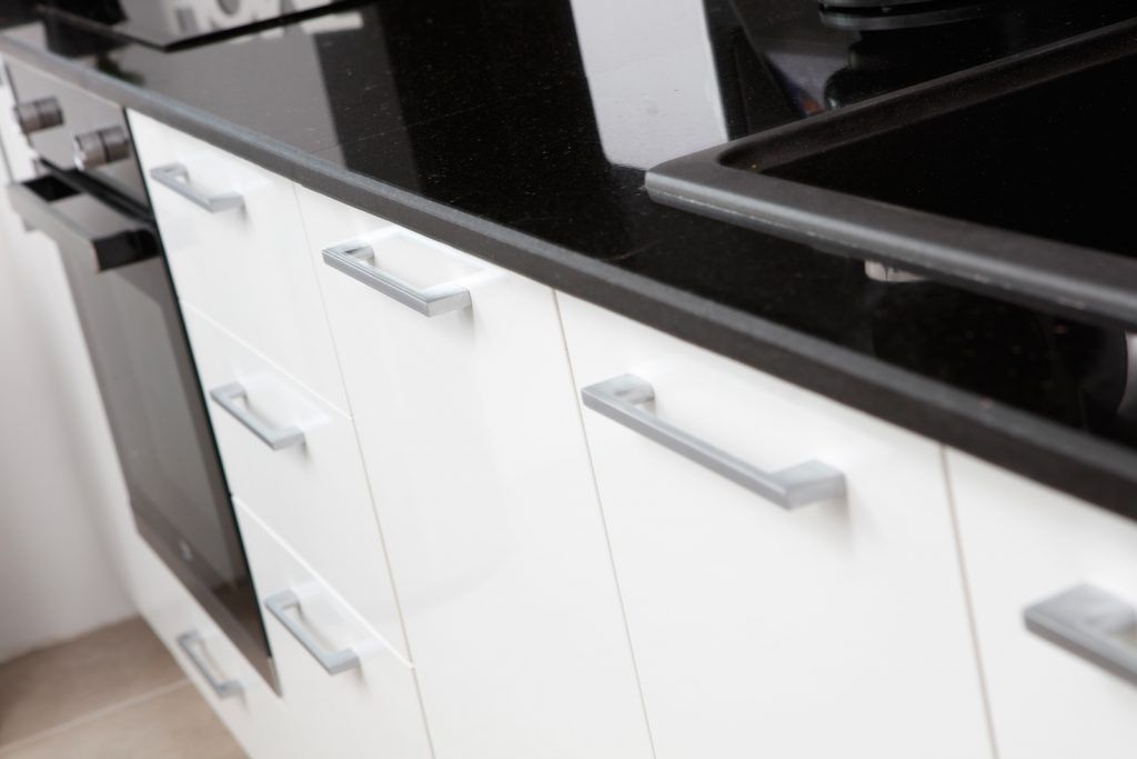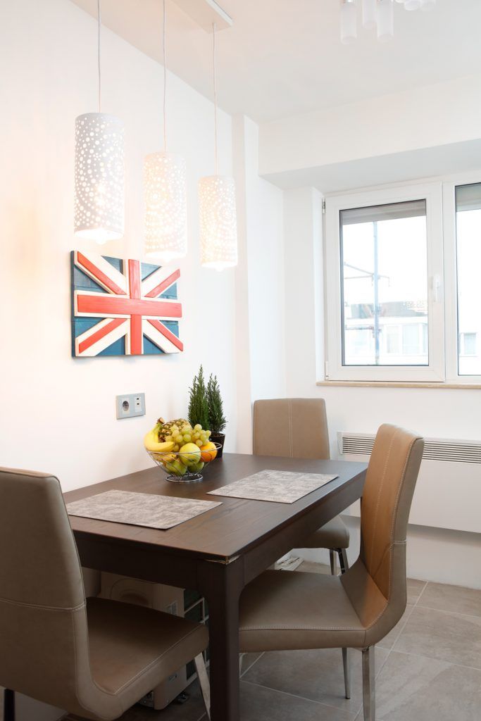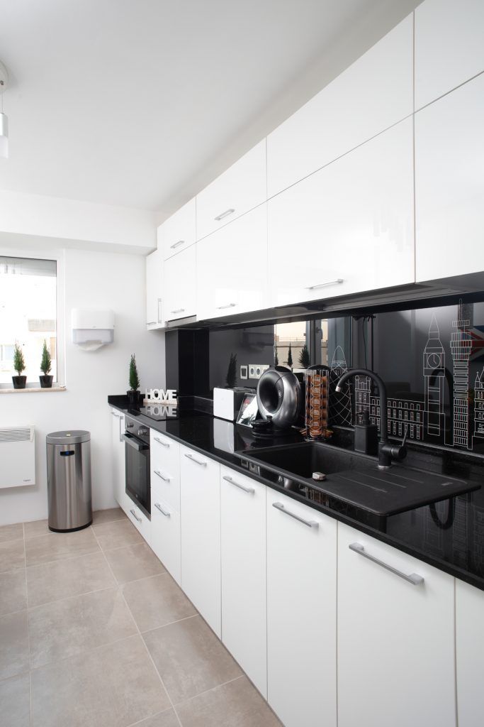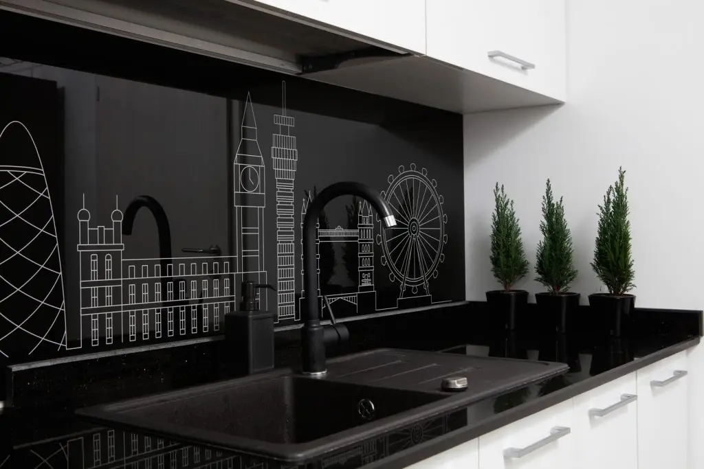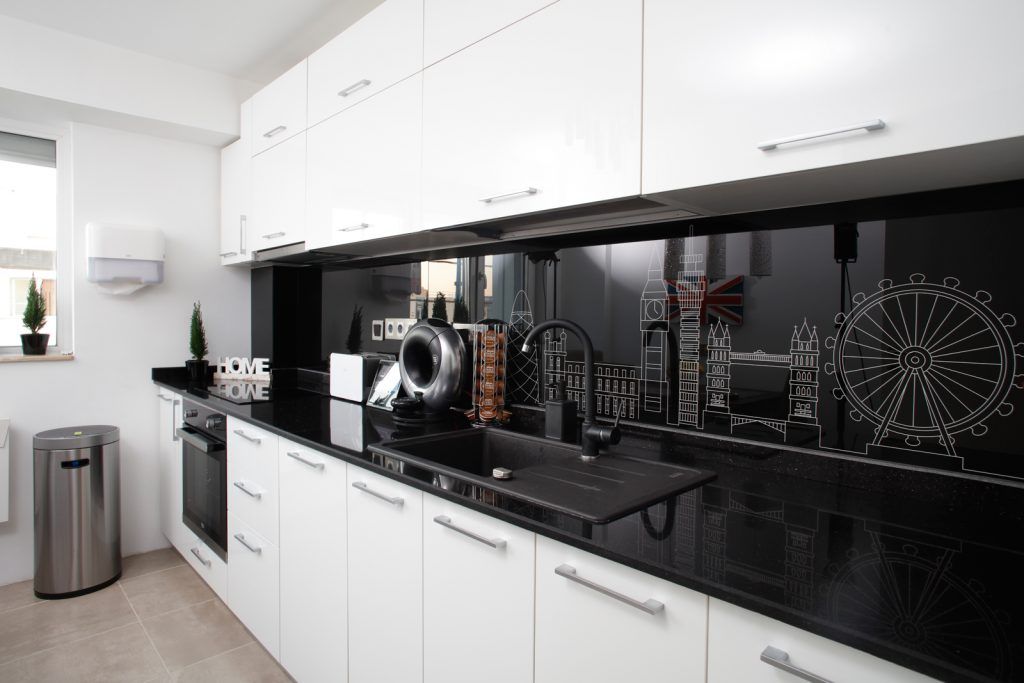 Conceptul bucatariei are la baza un contrast puternic si elegant intre mobilierul din mdf vopsit alb si negrul utilizat la blatul de lucru, electrocasnice si chiuveta. Aparenta monotonie este intrerupta armonios de backsplash-ul din sticla neagra printata cu silueta Londrei, realizata de Moteco Facade. Aceasta face trecerea intre cele doua culori si confera dinamism spatiului. Mobilierul modern, produs de Cubus, impreuna cu locul de luat masa, fac trimitere catre viata londoneza, atat de draga proprietarilor.