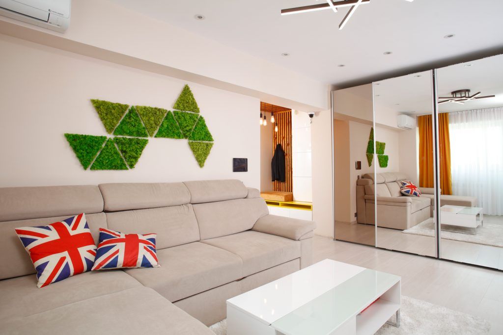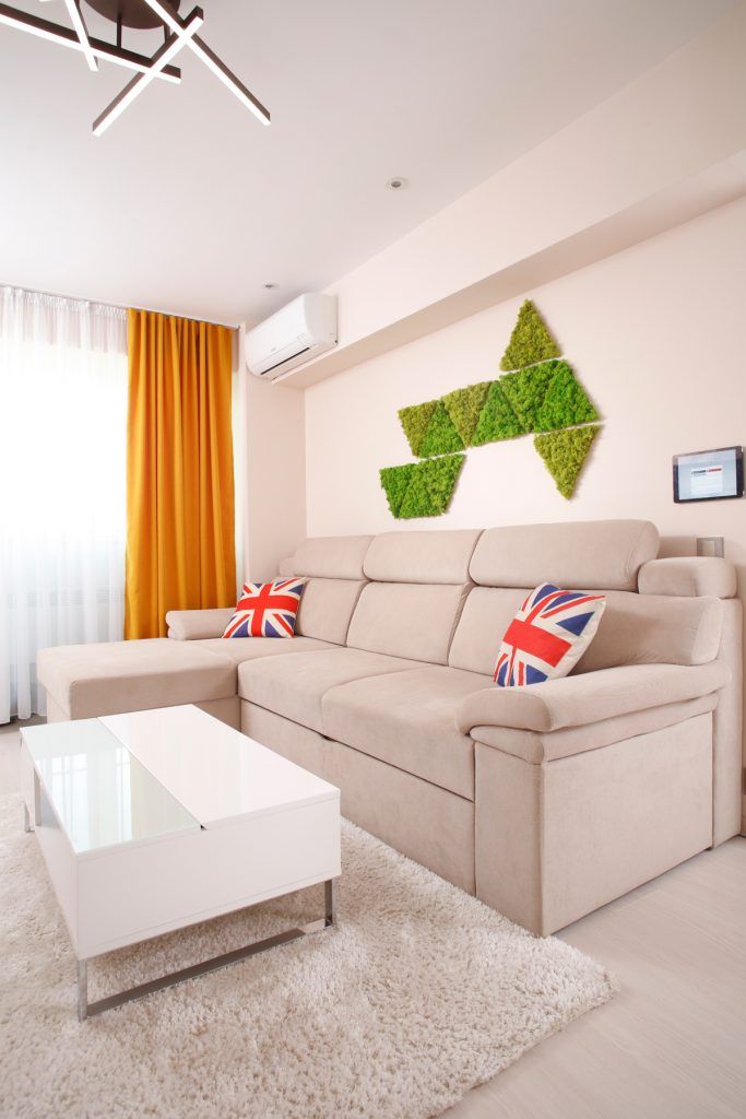 Din cauza spatiului redus a dormitorului, s-a optat pentru amplasarea dressingului in living, camuflat in spatele unei oglinzi mari, folosita si ca un truc pentru a amplifica vizual spatiul. Fundalul neutru al zonei de zi este accentuat de verdele natural al lichenilor si nuanta de portocaliu al materialului textil folosit la draperie.