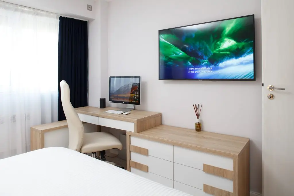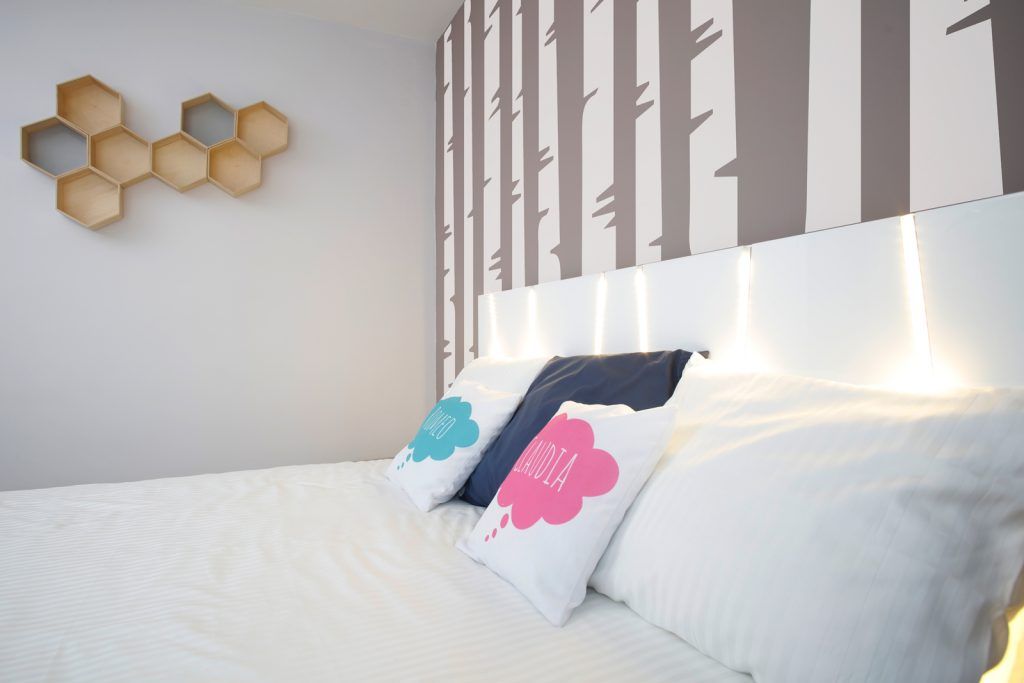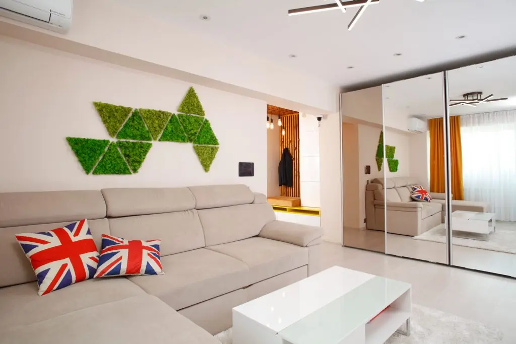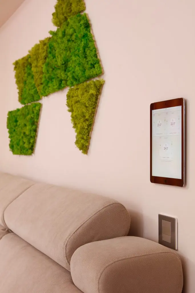 Prin inserarea elementelor de tehnologie in locuinta nu s-a dorit pierderea legaturii cu natura, astfe incat au fost utilizati licheni naturali pentru decorarea peretelui din spatele canapelei si un tapet cu grafica unor siluete de copaci in dormitor (produs de Stickero).