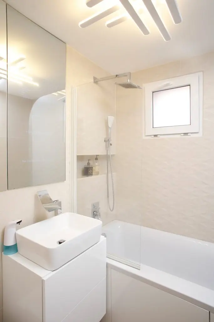 Baia respecta conceptul cromatic, aceasta fiind dominata de albul mobilierului si finisajul crom al bateriilor, puse in valoare de nuanta crem a gresiei si faiantei. Elementul cheie al amenajarii baii il constituie oglinda smart tech , care afiseaza ora, calendarul, prognoza meteo etc. Conform arhitectului, nici baia “nu face exceptie de la procesul de usurare a vietii de zi cu zi a beneficiarilor, prin tehnologie “.