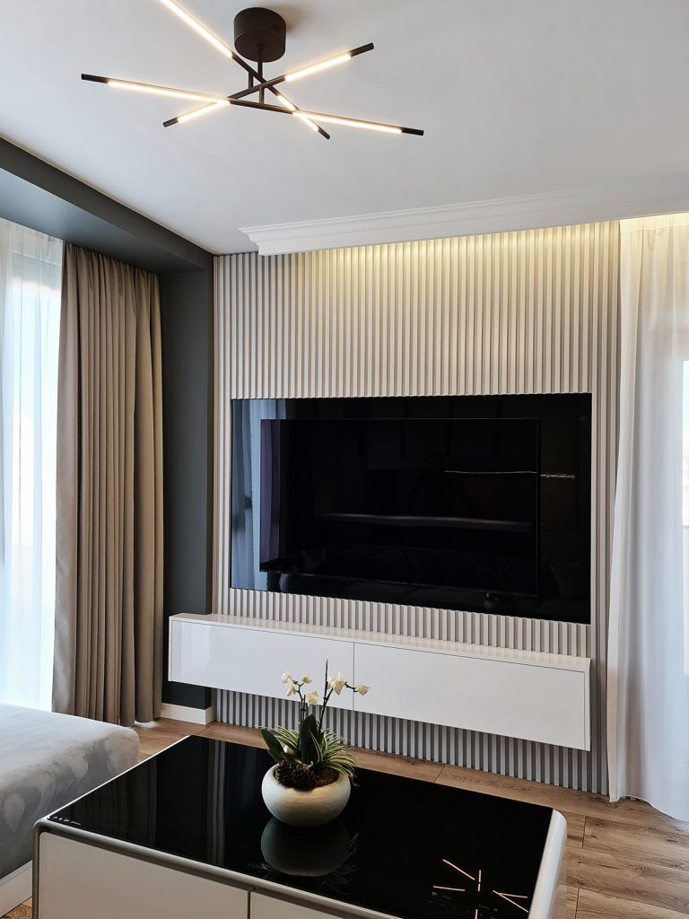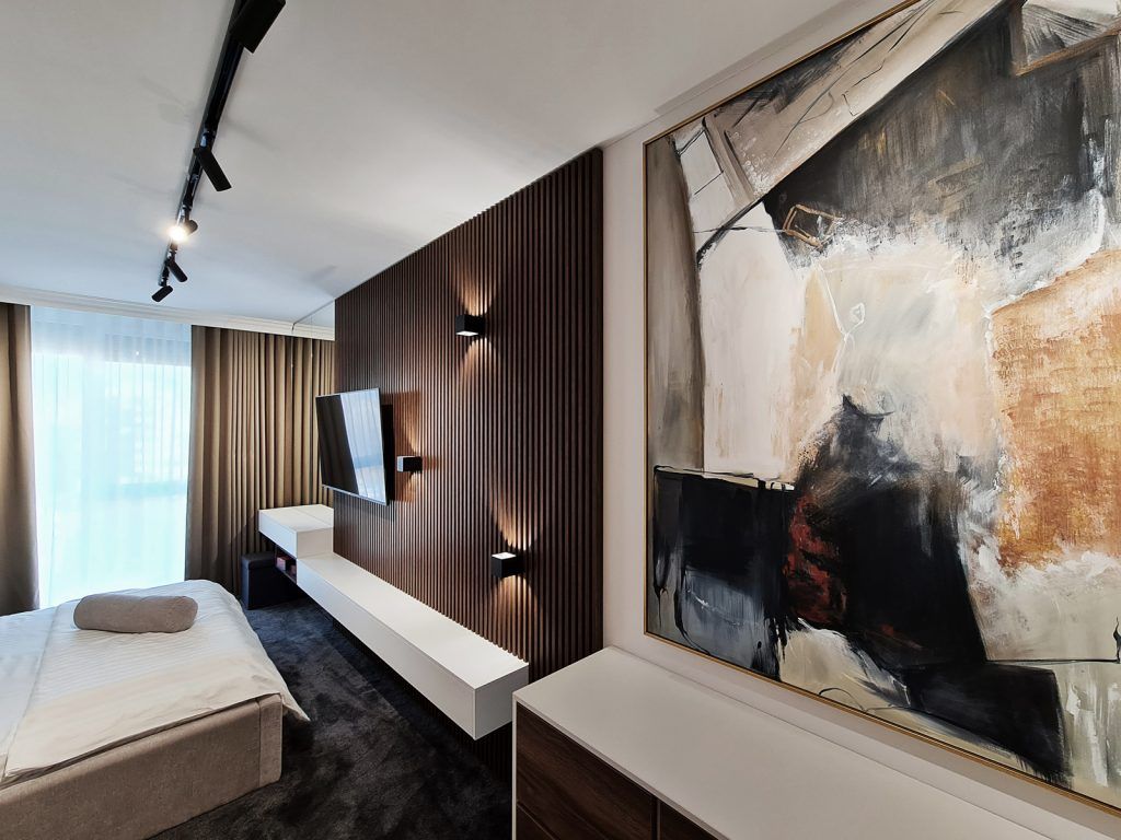 In baza conceptului general, de a crea contraste puternice si a folosi nuante neutre, tonuri de maro, griuri, crem, au fost propuse materiale premium: mdf vopsit, pal premium Egger, mocheta si parchet trafic intens Diego, corpuri de iluminat de la Prima Lighting Arad.