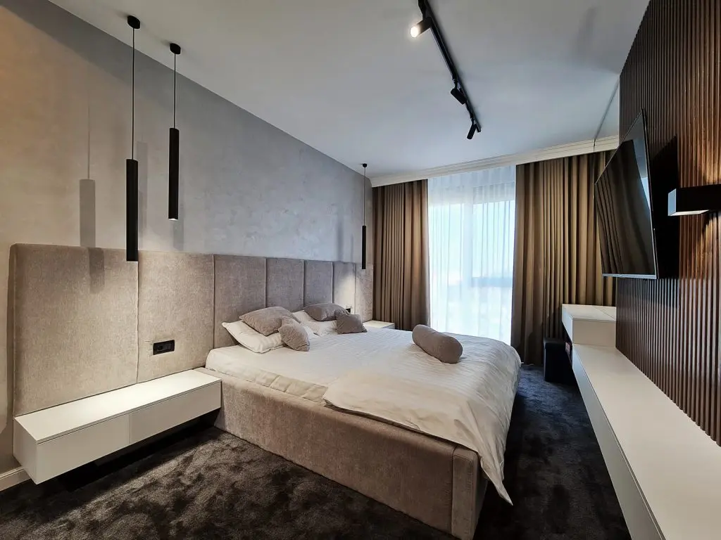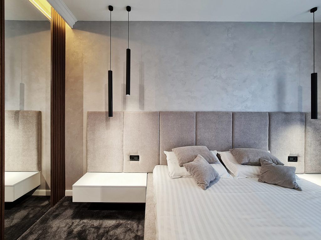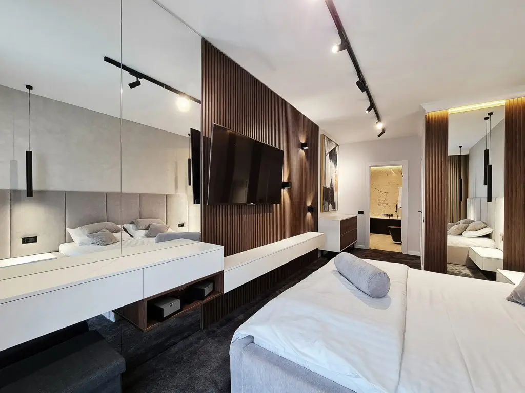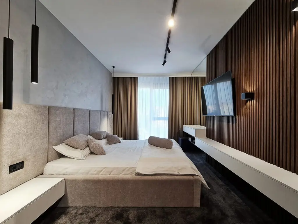 Clientii sunt un cuplu tanar, fara copii, astfel ca momentan a fost amenajat doar un dormitor din cele doua. Stilul abordat aici este o continuare fireasca a amenajarii din zona de zi, un stil contemporan luxos, dar totodata primitor si calduros. Predomina nuante calde de gri, contrastate armonios de textura si nuanat inchisa de lemn.