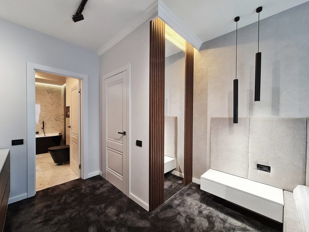 Mocheta contribuie la senzatia generala de confort si constituie un fundal contrastant pentru piesele de mobilier. Oglinzile dubleaza spatiul si dau senzatia de mai multa lumina naturala.