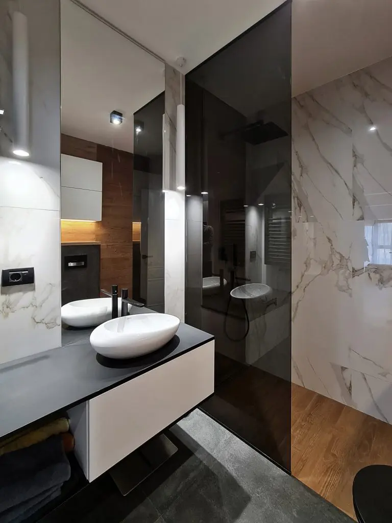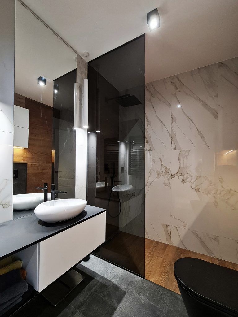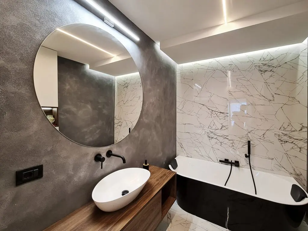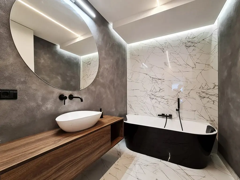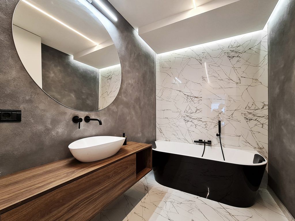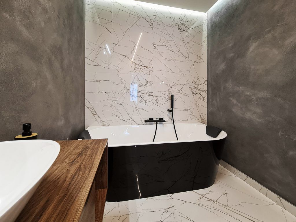 Dormitorul matrimonial are baia proprie, cu cada freestanding si obiecte sanitare negre ce contrasteaza puternic cu finisajele din marmura alba.