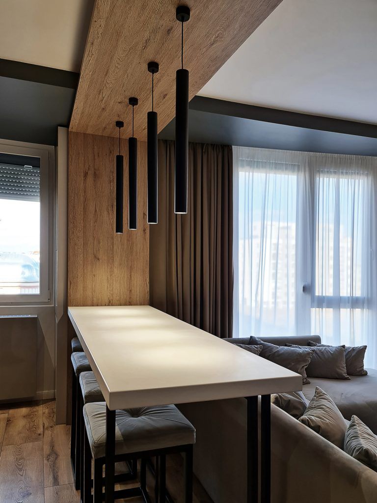 Marea provocare a acestui proiect a constat in crearea unui loc de luat masa fiind un open space mic, de 28 de metri patrati. A optat pentru varianta de blat de bar cu scaune inalte, amplasate cu fata catre televizor.