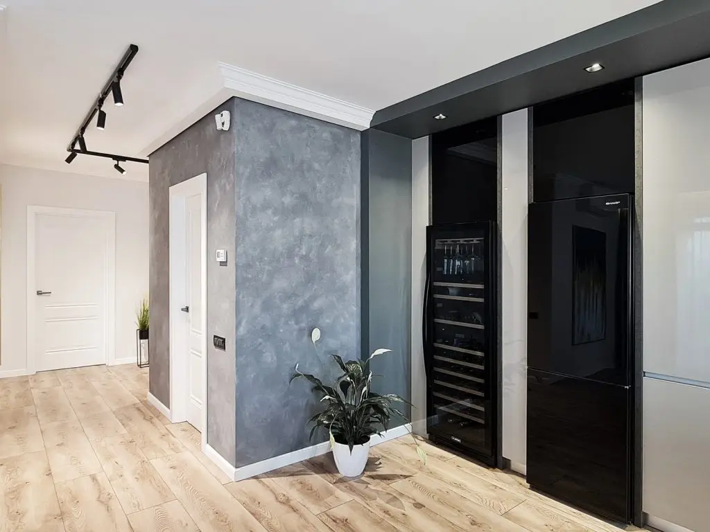 In procesul de amenajare arhitectul a luat in calcul preferintele clientilor, de a avea spatiu pentru socializare cat mai ergonomic si confortabil posibil, o bucataria generoasa complet echipata si o vitrina de vinuri langa frigider.