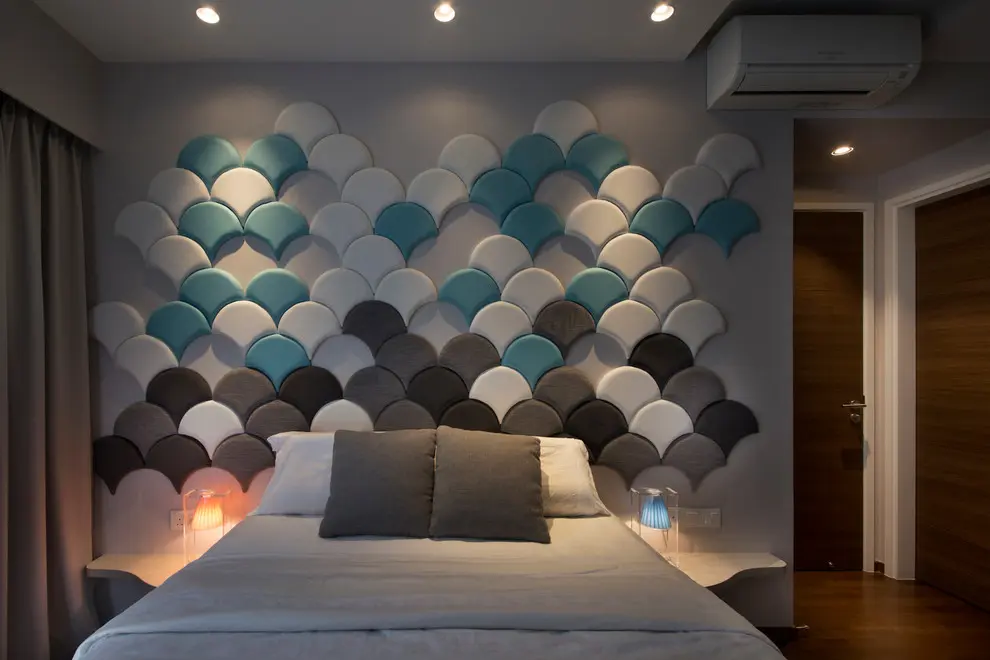 Pentru un plus de unicitate in dormitor, arhitectii au realizat o tablie pentru pat din diverse bucati de material in culori pastelate care se completeaza cromatic. Designul fresh al tabliei de pat adauga un strop de stil contemporan dormitorului pastrand in acelasi timp stilul clasic in care acesta este decorat.