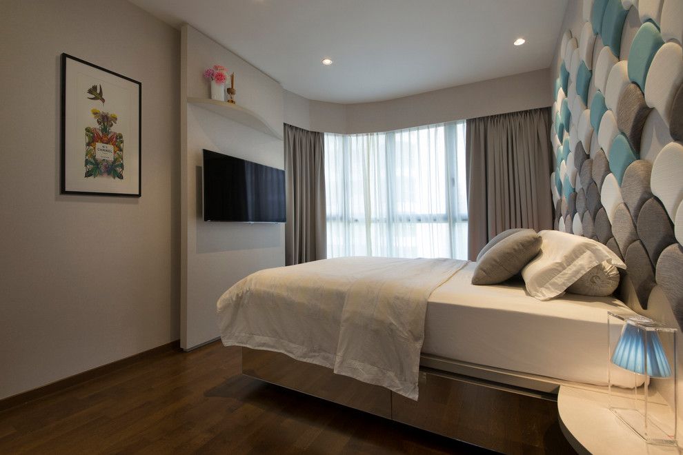 Pentru un plus de unicitate in dormitor, arhitectii au realizat o tablie pentru pat din diverse bucati de material in culori pastelate care se completeaza cromatic. Designul fresh al tabliei de pat adauga un strop de stil contemporan dormitorului pastrand in acelasi timp stilul clasic in care acesta este decorat.