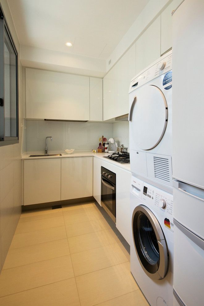 Bucataria integreaza si o zona dedicata spalatoriei, in timp ce restul spatiului se axeaza pe functionalitate. Liniile simple, mobilierul dispus in forma de L, asigura strictul necesar.