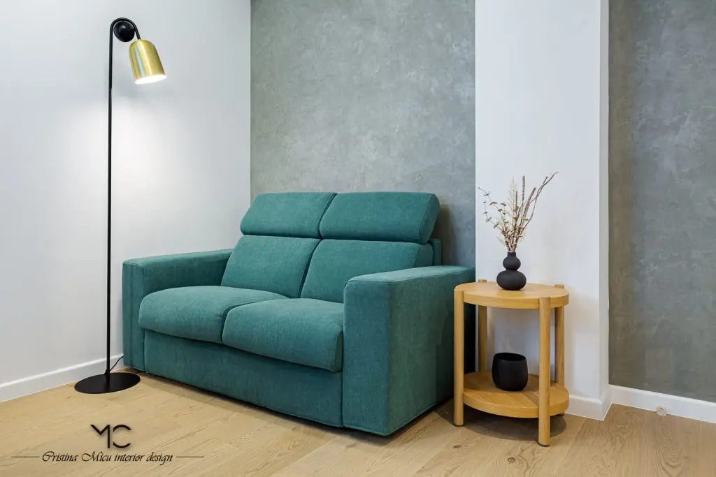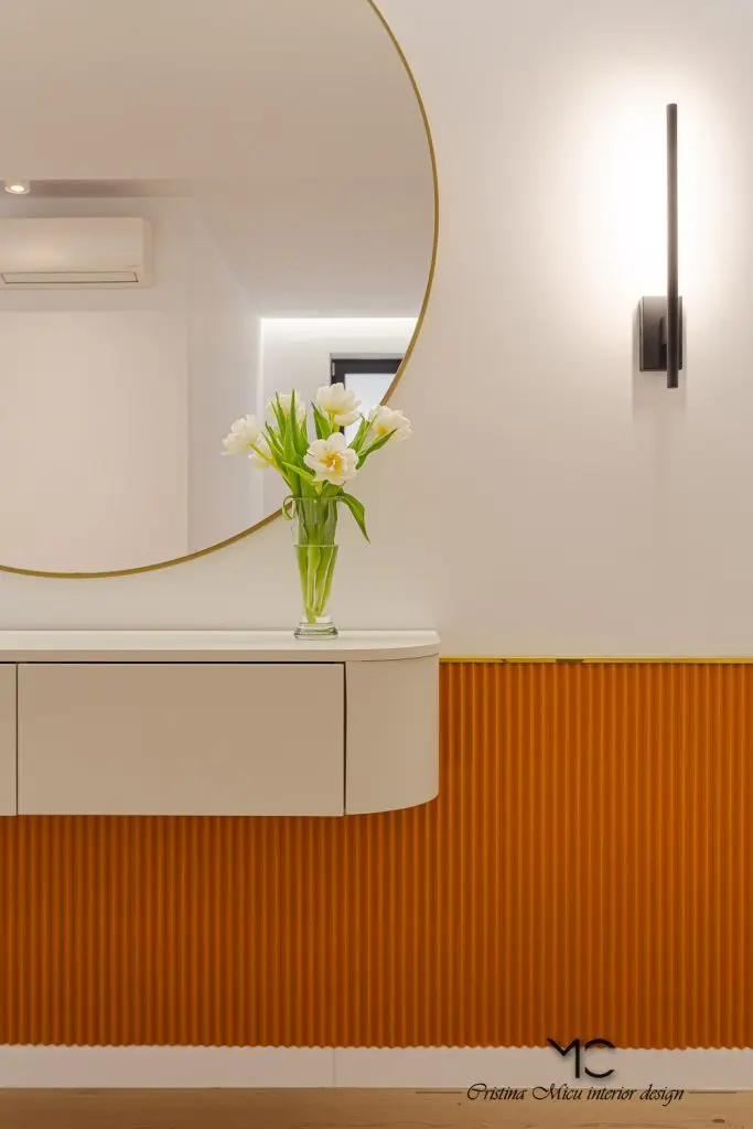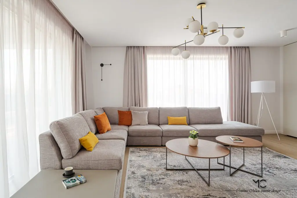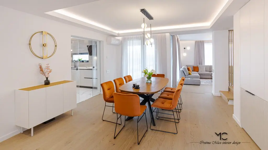 Pornind de la stilul si necesitatile beneficiarilor, a fost propus un concept unitar, cu accentul pe confort, dorindu-se o amenajare aerisita, luminoasa, optimista. Au fost alese in principal culori neutre, tonuri elegante de culoare, puse in valoare de accente de culori intense (catifeaua oranj a scaunelor din dining, nuantele de albastru din dormitor , fotoliul- accent galben).