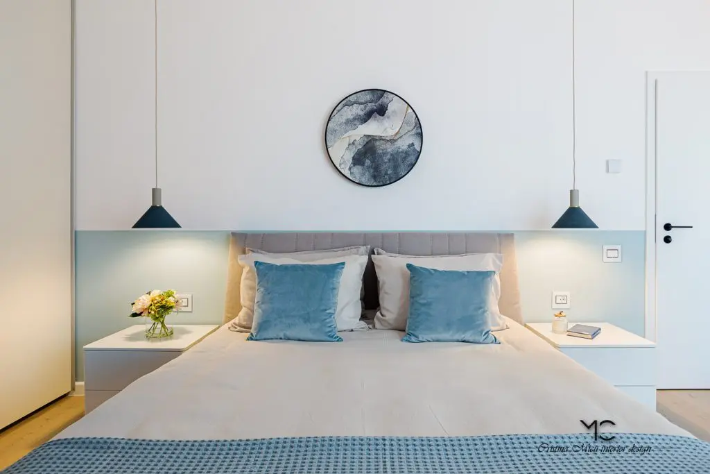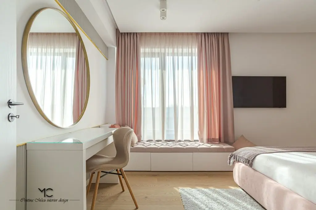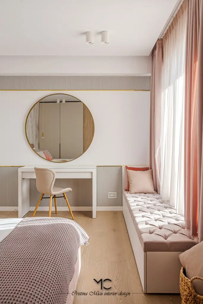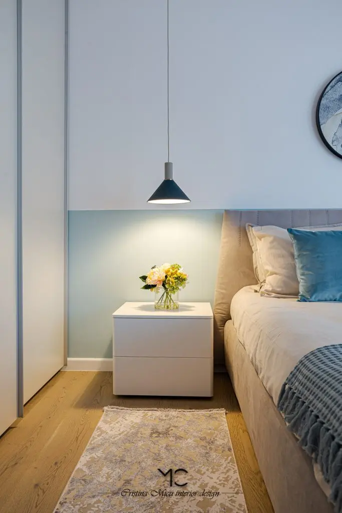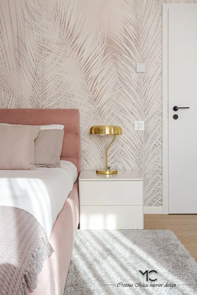 Cristinapovesteste ca “tapetul de la Zen Interior, cu patternul unor frunze de palmier in nuanta de roz pudrat, vine sa accentueze frumos patul tapitat si sa creeze un element de accent boem in dormitor. Scafa cu lumina difuza indirecta pune si ea in evidenta finisajul tapetului.”