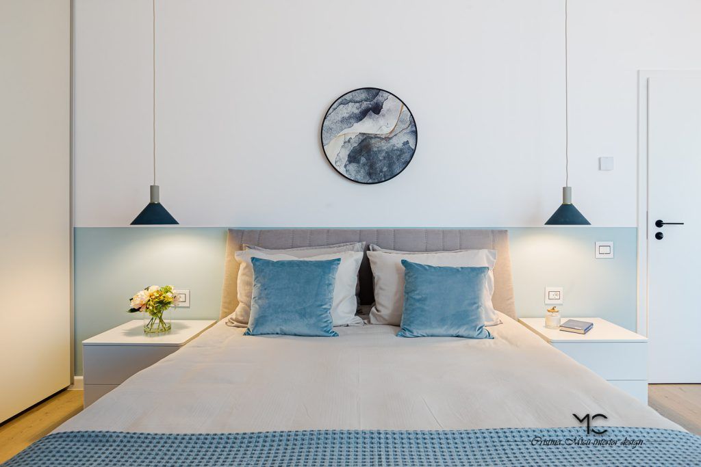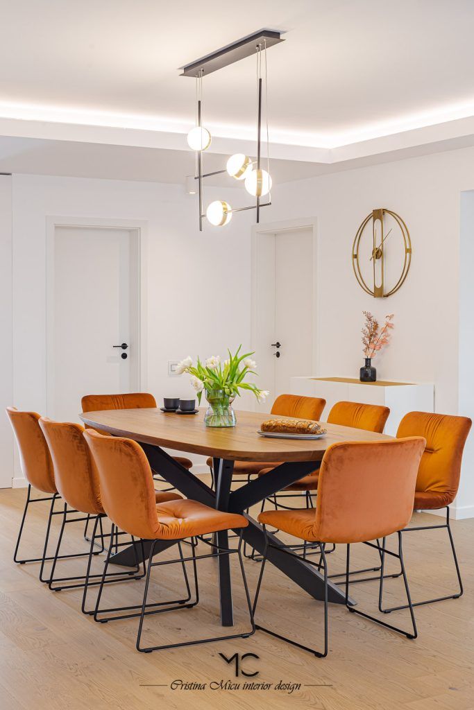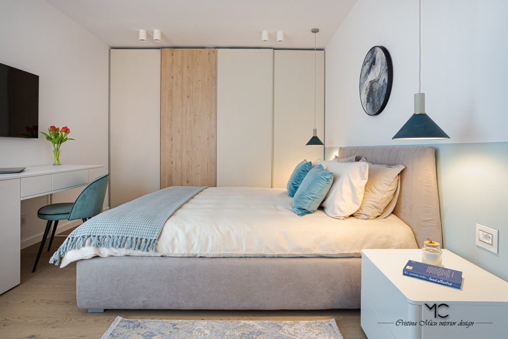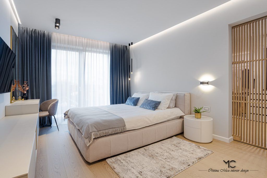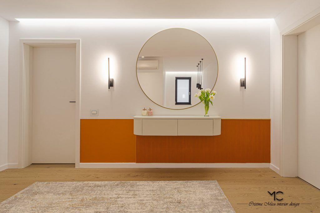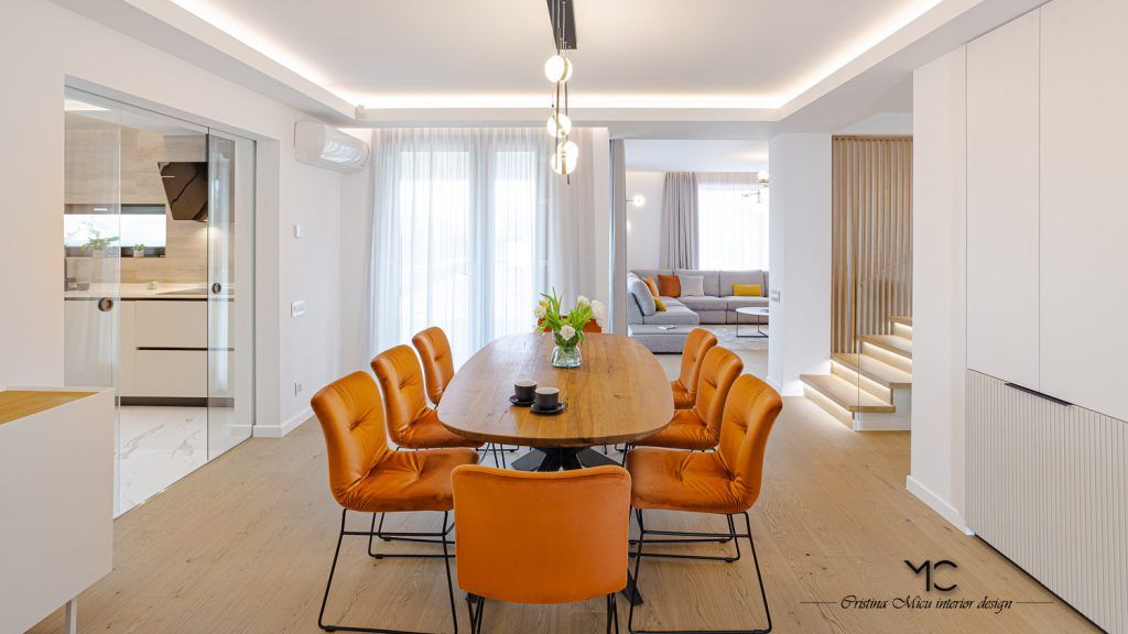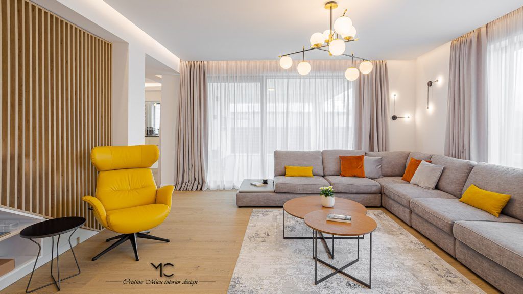 Pornind de la stilul si necesitatile beneficiarilor, a fost propus un concept unitar, cu accentul pe confort, dorindu-se o amenajare aerisita, luminoasa, optimista. Au fost alese in principal culori neutre, tonuri elegante de culoare, puse in valoare de accente de culori intense (catifeaua oranj a scaunelor din dining, nuantele de albastru din dormitor , fotoliul- accent galben).