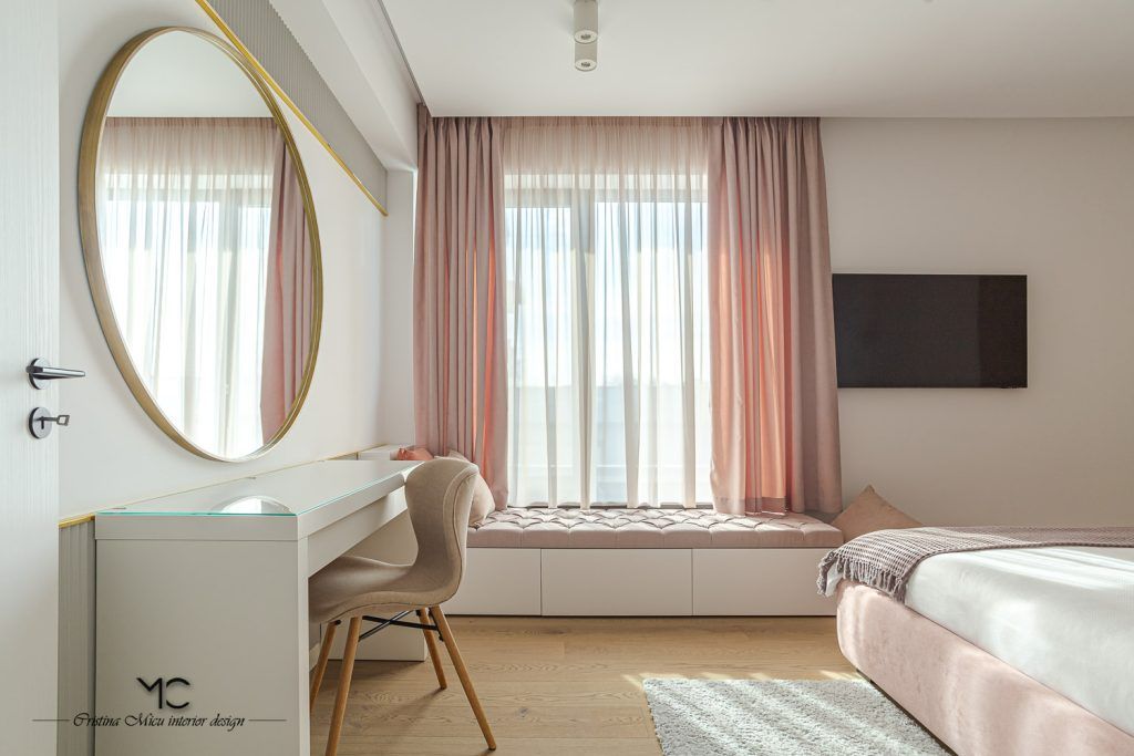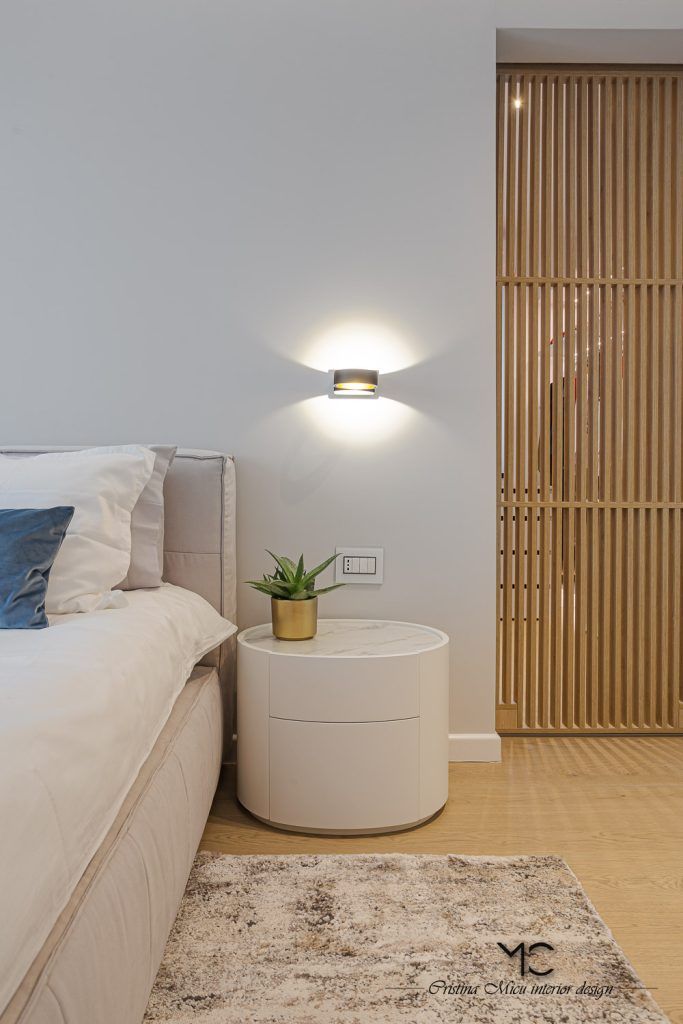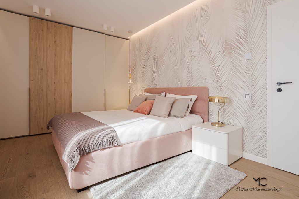 Cristinapovesteste ca “tapetul de la Zen Interior, cu patternul unor frunze de palmier in nuanta de roz pudrat, vine sa accentueze frumos patul tapitat si sa creeze un element de accent boem in dormitor. Scafa cu lumina difuza indirecta pune si ea in evidenta finisajul tapetului.”