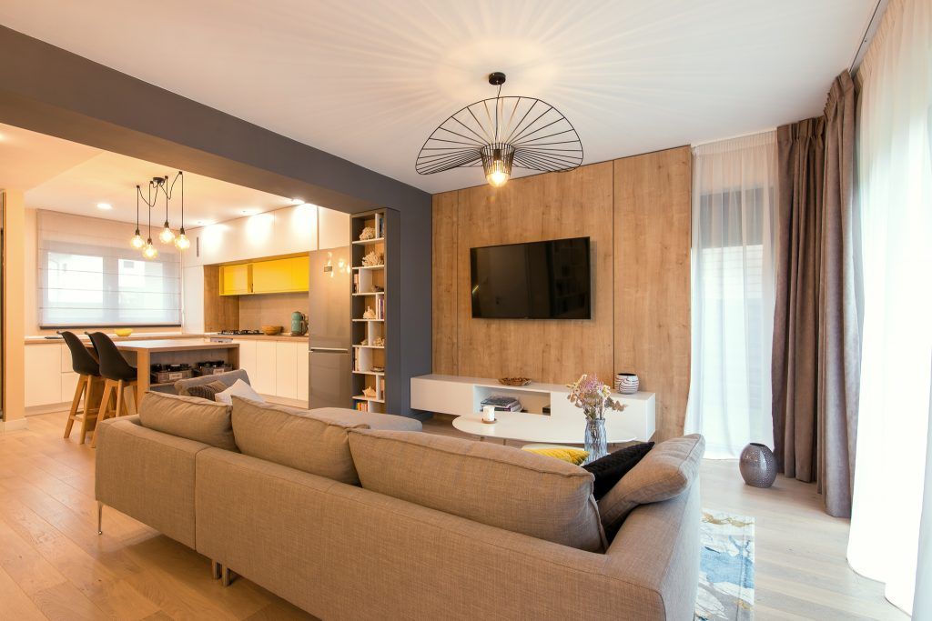 Conceptul amenajarii a avut la baza preferintele beneficiarilor: un design minimalist, scandinav, culori deschise si folosirea unor materiale naturale. Astfel, a fost aleasa o paleta cromatica neutra, predomina nuantele de gri pe care se evidentiaza accentele puternice de galben-intens.