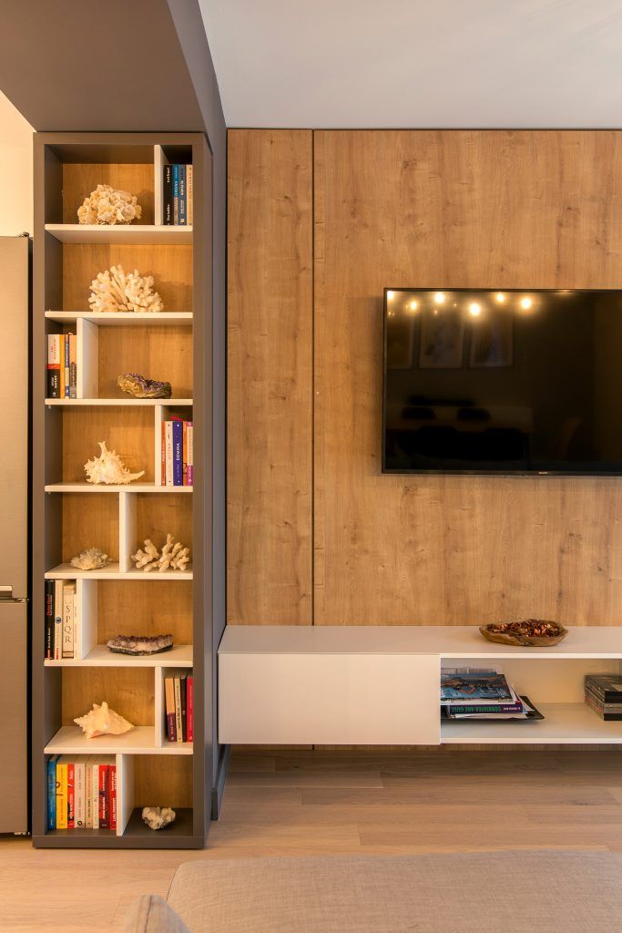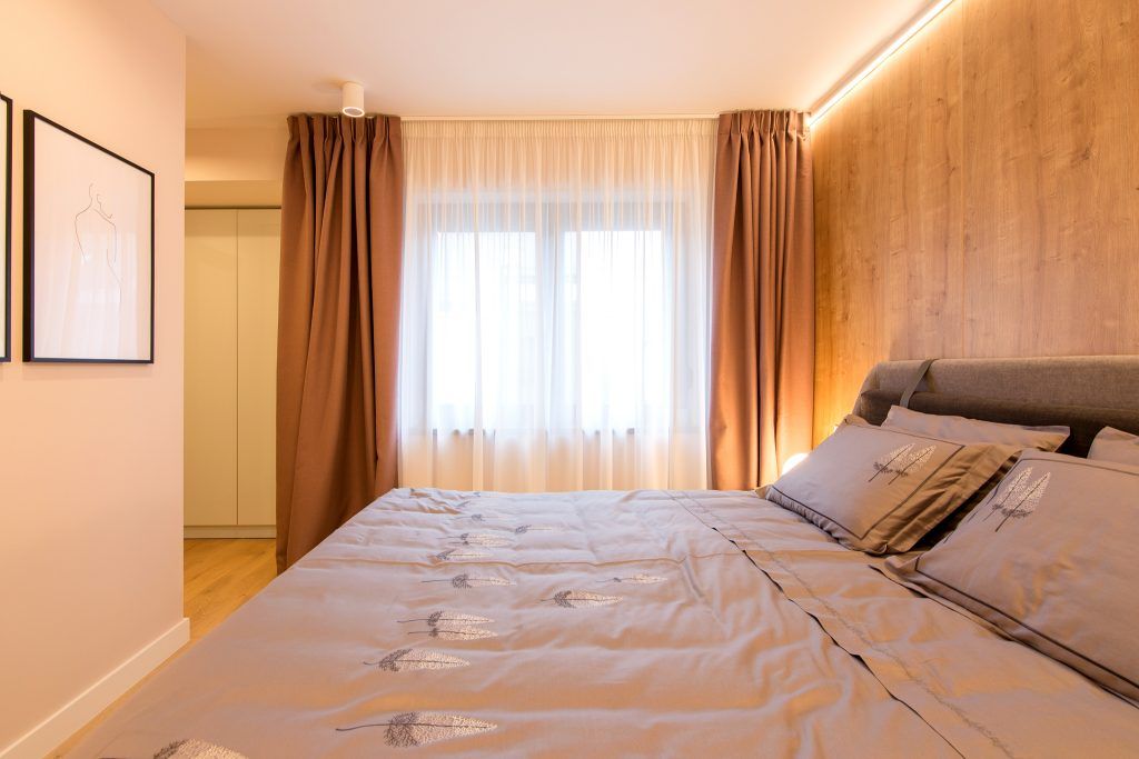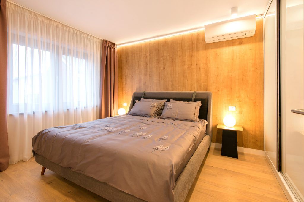 Clientii nu au vrut sa includa in amenajarea locuintei lor tapetul sau vopseaua decorativa; insa au aprobat cu entuziasm varianta unei placari cu placi de lemn a peretelui din spatele televizorului din living si a peretelui din spatele patului matrimonial (accentuat prin iluminare cu led).