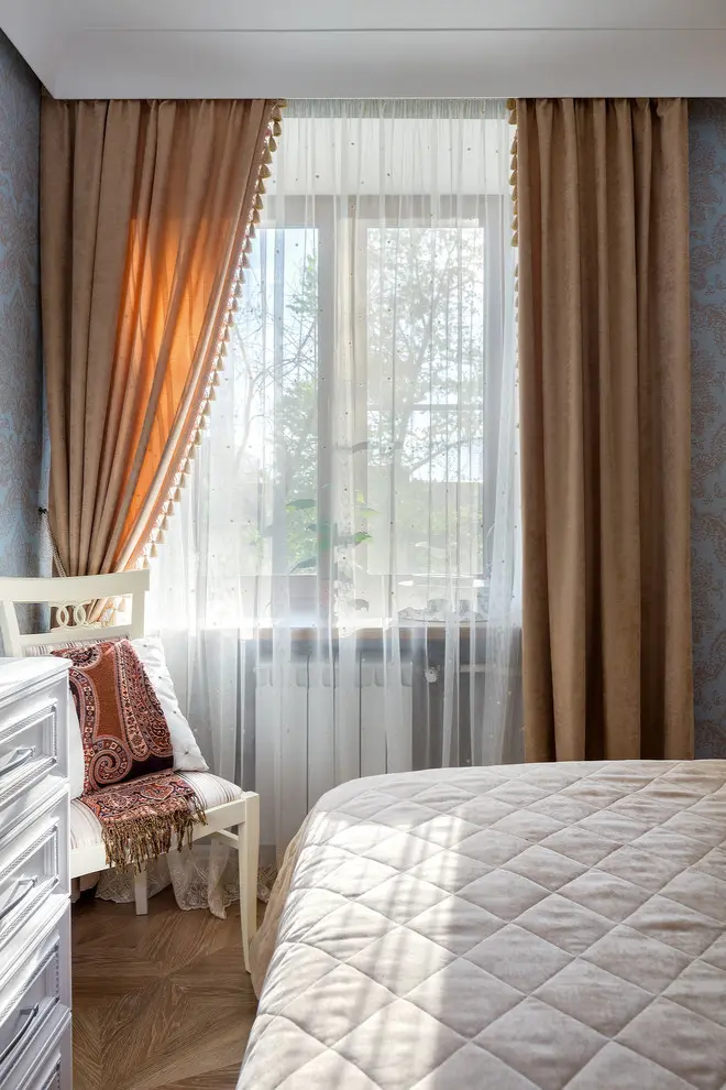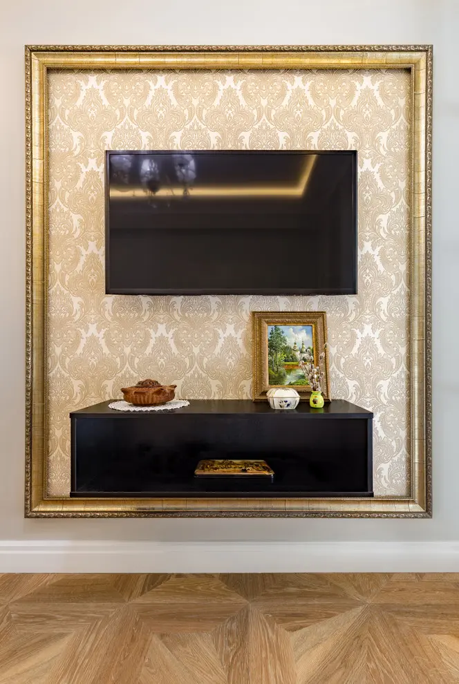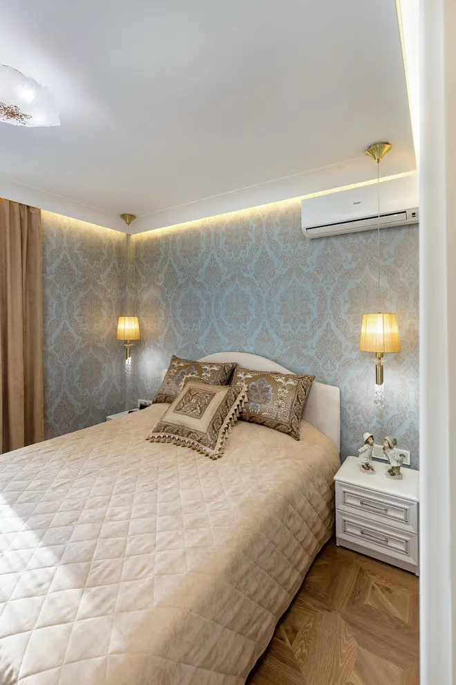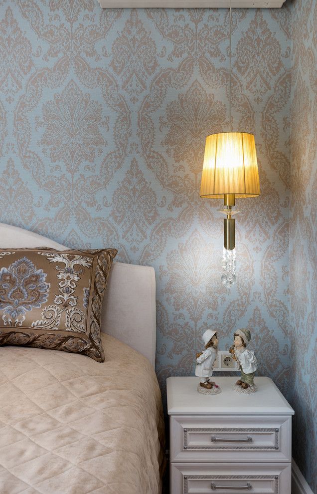 Dormitorul matrimonial pastreaza paleta cromatica regasita in bucatarie si aduce in prim plan un tapet clasic cu accente aurii. Pattern-ul tapetului se regaseste si in accesoriile care dau patului caracterul retro si elegant.
