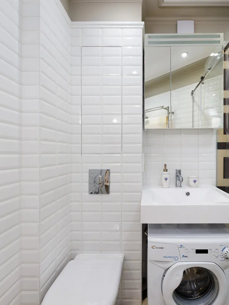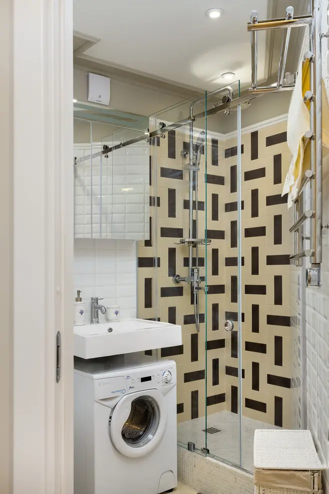 Design-ul baii pleaca de la ideea unui alt plan temporal si anume, unul modern, simplist, geometric. Dispunerea placilor de gresie fac posibila obtinerea unui pattern liniar, cu un impact vizual puternic, comparativ cu o iluzie optica. Sticla devine si aici un material cu rol principal, iar impreuna cu albul imaculat si oglinda, fac posibila o largire vizuala a incaperii cu dimensiuni reduse.