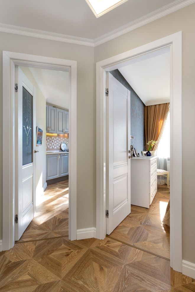 In spatiul de trecere si de legatura a celorlalte incaperi, unde intreaga poveste a amenajarii se prezinta concret prin design-ul tutoror componentelor, mobilierul si corpurile de iluminat vin in cadrul prezentarii cu un aspect vintage, parchetul se ascunde sub imaginea unui linoleum clasic, iar accesoriile si accentele aurii aduc in discutie eleganta unui spatiu temporal indepartat.