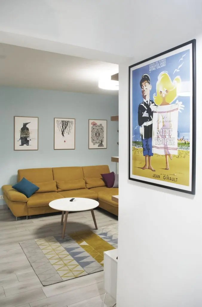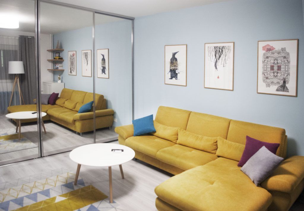 De aceea, deloc intamplatoare este schema de culori folosita. Accentele de galben pe care le intalnim sub diferite forme: de la canapea pana la accesorii, cum ar fi covorul, sau scaunele din bucatarie de la Som Product, imprima veselie si dinamica spatiului, iar tonurile calme de albastru din living, bucatarie sau baie exprima masculinitate si seriozitate, echilibrand astfel cromatica.