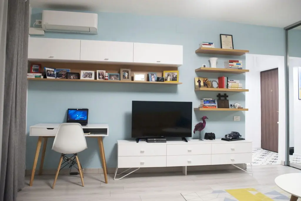 Principala zona de depozitare se afla in camera, care tine loc si de living si dormitor, sub forma dulapurilor inalte pana in tavan si cu usi acoperite cu oglinzi. Astfel, se creeaza un efect vizual de largire a spatiului.