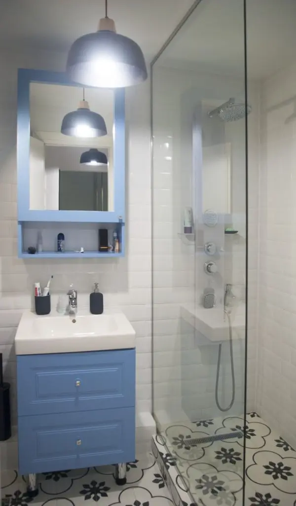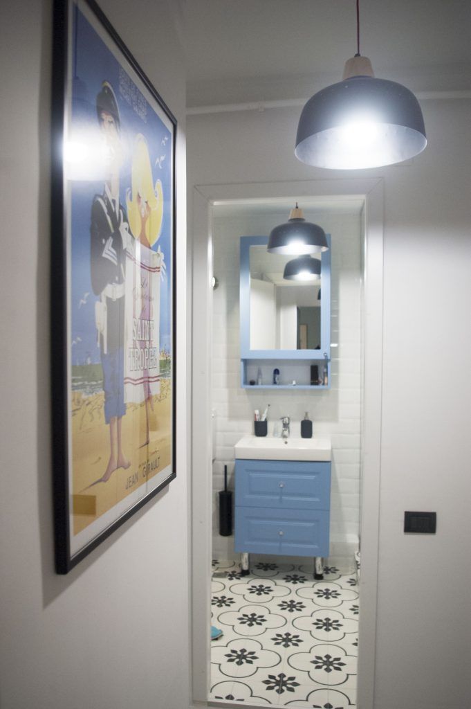 In bucatarie, amenajarea urmeaza aceeasi abordare functionala desfasurata in intreaga locuinta. Fundalul alb scoate in evidenta contrastul dintre mobilierul albastru si accentele de galben ale scaunelor. Placile decorative se continua din hol si in bucatarie oferind astfel un efect de continuitate. Si in baie s-a mizat pe acelasi tipar, spatiul fiind optimizat prin amenajarea unei zone de dus tip walk-in. Atat in bucatarie cat si in baie, mare parte din mobilier a fost realizat pe comanda.