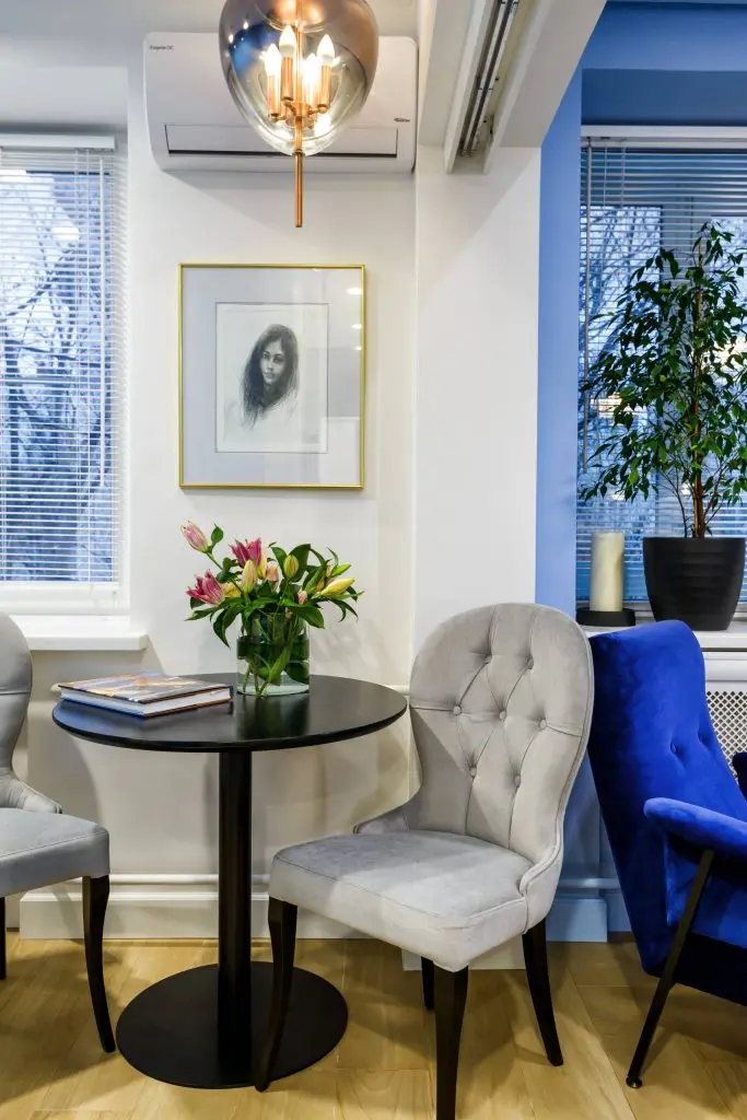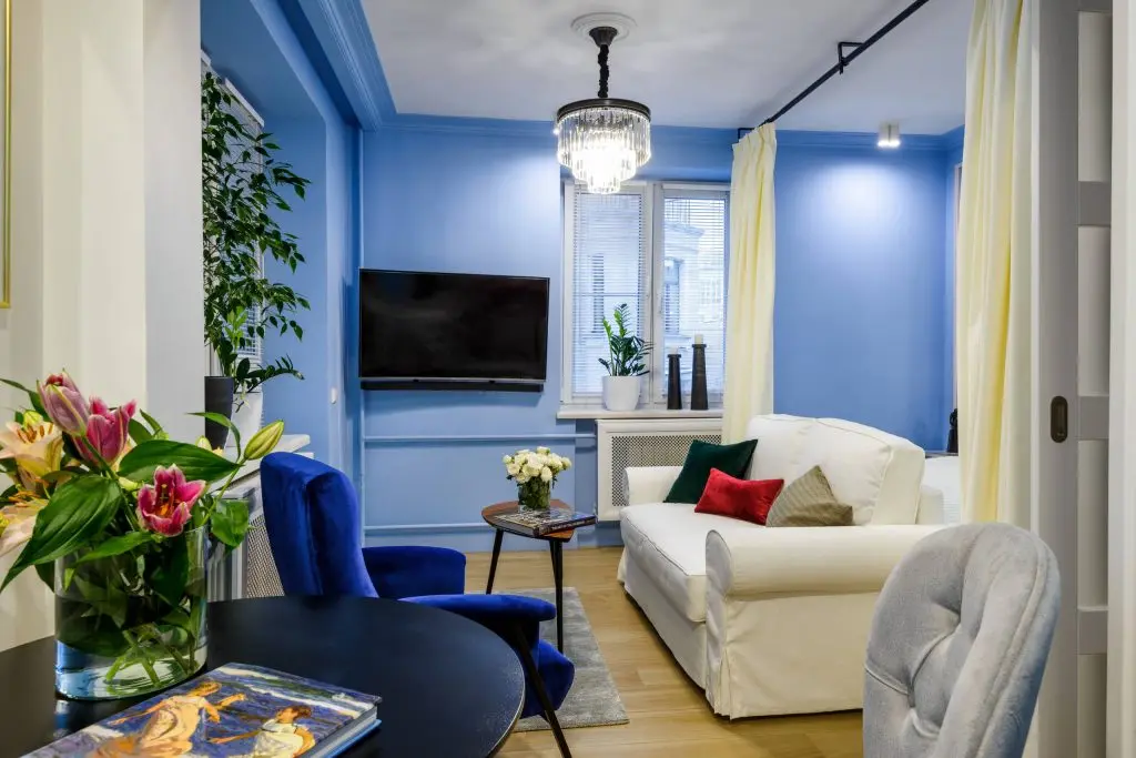In "living" mobilarea se axeaza pe piesele principale: o canapea extensibila, o masuta din lemn pentru cafea, citit si un T V. Lustra completeaza intr-un mod elegant atmosfera creata iar tema naturii isi face aparitia prin intermediul plantelor decorative si bineinteles prin culoarea albastru ce ne duce cu gandul la mare, cer.