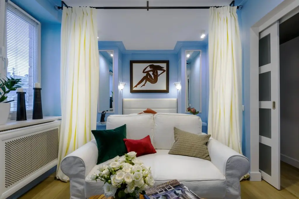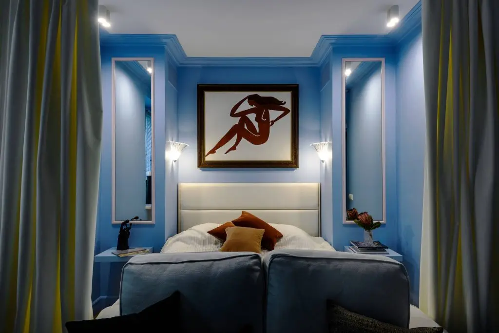 "Dormitorul" este separat de living vizual cu ajutorul unor draperii crem, ce ofera intimitate si un aspect placut. Piesa principala este patul generos (160200) si tapitat ce aduce impreuna cu texturile alese un plus de confort. Simetria realizata prin intermediul oglinzilor si corpurile de iluminat ajuta la obtinerea unui echilibru vizual si la o imagine de asamblu placuta.