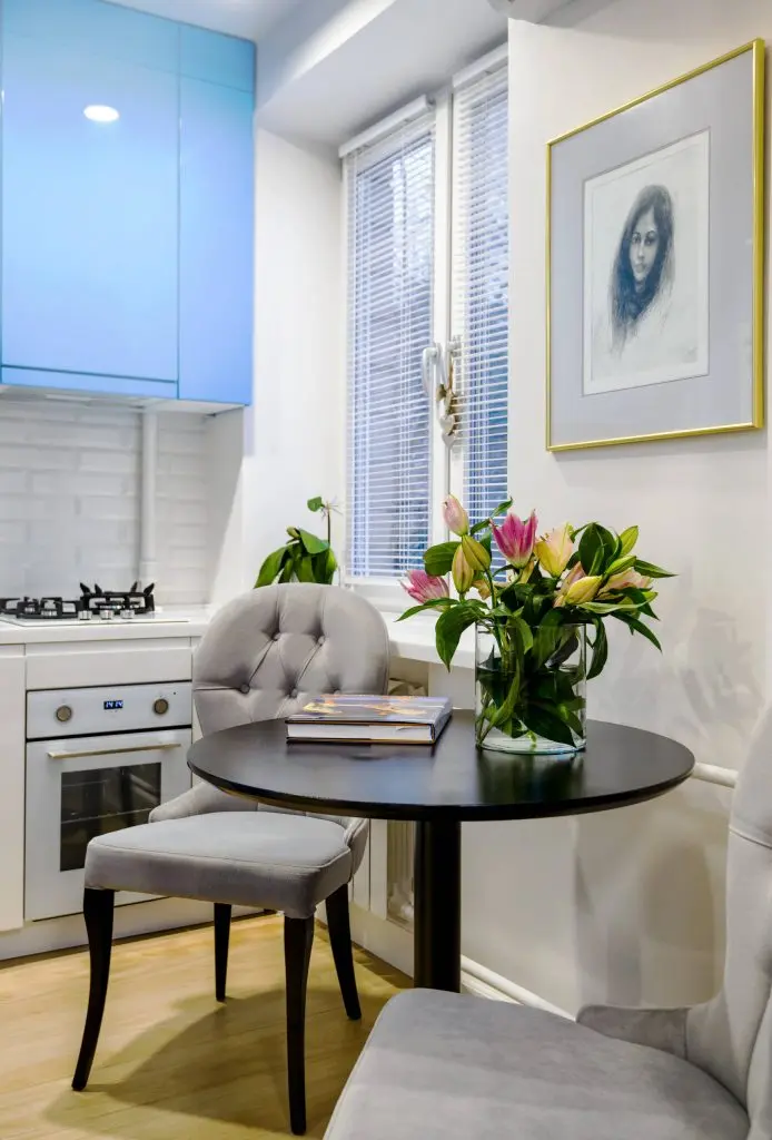 Bucataria este totusi separata de restul casei prin intermediul unei usi glisante, astfel se poate gati fara problema raspandirii mirosului neplacut in intreaga casa. Dispunerea mobilierului in forma literi L ajuta la optimizarea spatiului iar pentru un plus de unitate si ordine, electrocasnicele au fost incorporate. Spatiul de doar 5.6 mp a permis si integrarea unui loc elegant, amenajat pentru luat masa si pentru socializare.