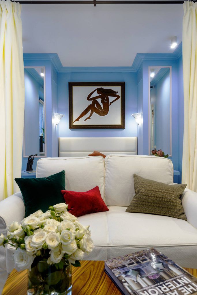 "Dormitorul" este separat de living vizual cu ajutorul unor draperii crem, ce ofera intimitate si un aspect placut. Piesa principala este patul generos (160200) si tapitat ce aduce impreuna cu texturile alese un plus de confort. Simetria realizata prin intermediul oglinzilor si corpurile de iluminat ajuta la obtinerea unui echilibru vizual si la o imagine de asamblu placuta.