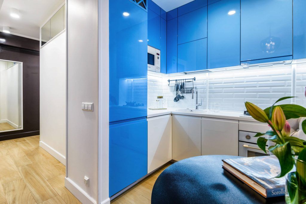 Bucataria este totusi separata de restul casei prin intermediul unei usi glisante, astfel se poate gati fara problema raspandirii mirosului neplacut in intreaga casa. Dispunerea mobilierului in forma literi L ajuta la optimizarea spatiului iar pentru un plus de unitate si ordine, electrocasnicele au fost incorporate. Spatiul de doar 5.6 mp a permis si integrarea unui loc elegant, amenajat pentru luat masa si pentru socializare.