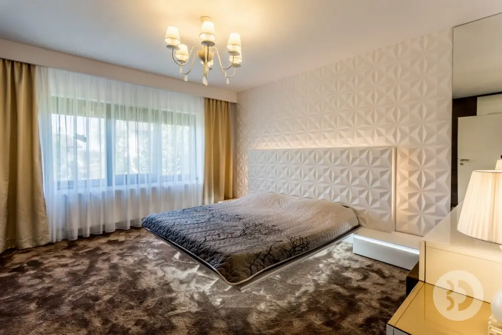Si in dormitorul matrimonial, Dana a mizat pe un design unic. “Cu ajutorul furnizorilor de panouri decorative si al producatorului de mobilier am reusit sa pun in practica conceptul gandit pentru dormitor. A iesit ceea ce mi-am dorit, astfel ca mobilierul pare ca scos din tipare. Placarile din P AL si mobilierul care include televizorul, cuprinde la interior multe haine si lenjerii de pat pe o structura de rafturi, toate usile avand diverse sisteme de deschideri atipice, de jos in sus pentru usile mari. Restul fronturilor din dormitor sunt din M DF vopsit.