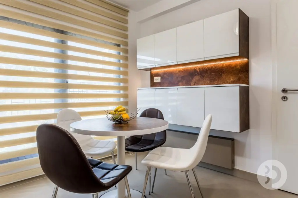 De asemenea, clientul si-a dorit ca zona de living sa fie intr-un fel delimitata de dining. Pentru ca avem totusi un open space, am mizat pe o separare vizuala realizata la nivelul pardoselii. Astfel, in zona de dining avem marmura, iar in partea de living, placi ceramice care imita fidel textura lemnului masiv. Jocul subtil al nuantelor si al texturilor face ca functiunile sa para separate dar unite in acelasi timp.