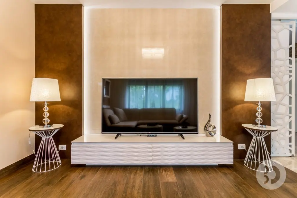 Nuanta de maro-brun a fost prelungita pe peretele cu televizorul, conturand astfel o simetrie in acest sector al camerei. Lumina indirecta laterala contribuie la crearea unui scenariu placut in contextul variat al iluminatului din acest spatiu.”