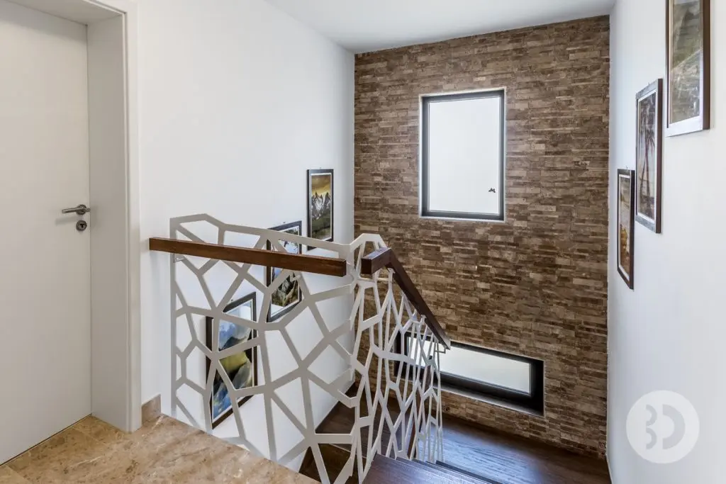“Respectand dorintele cuplului, am incercat sa inserez mai multe tipuri de piatra, dar si ceramica, facand niste treceri armonioase intre texturi si culori. Predomina contraste intre materiale lucioase si mate, dar si cate un contrast de culoare pe fiecare zona principala. Am incercat sa pastrez liniile curate in toate spatiile casei si sa aduc un strop de caldura prin nuantele si materiale inspirate de natura.